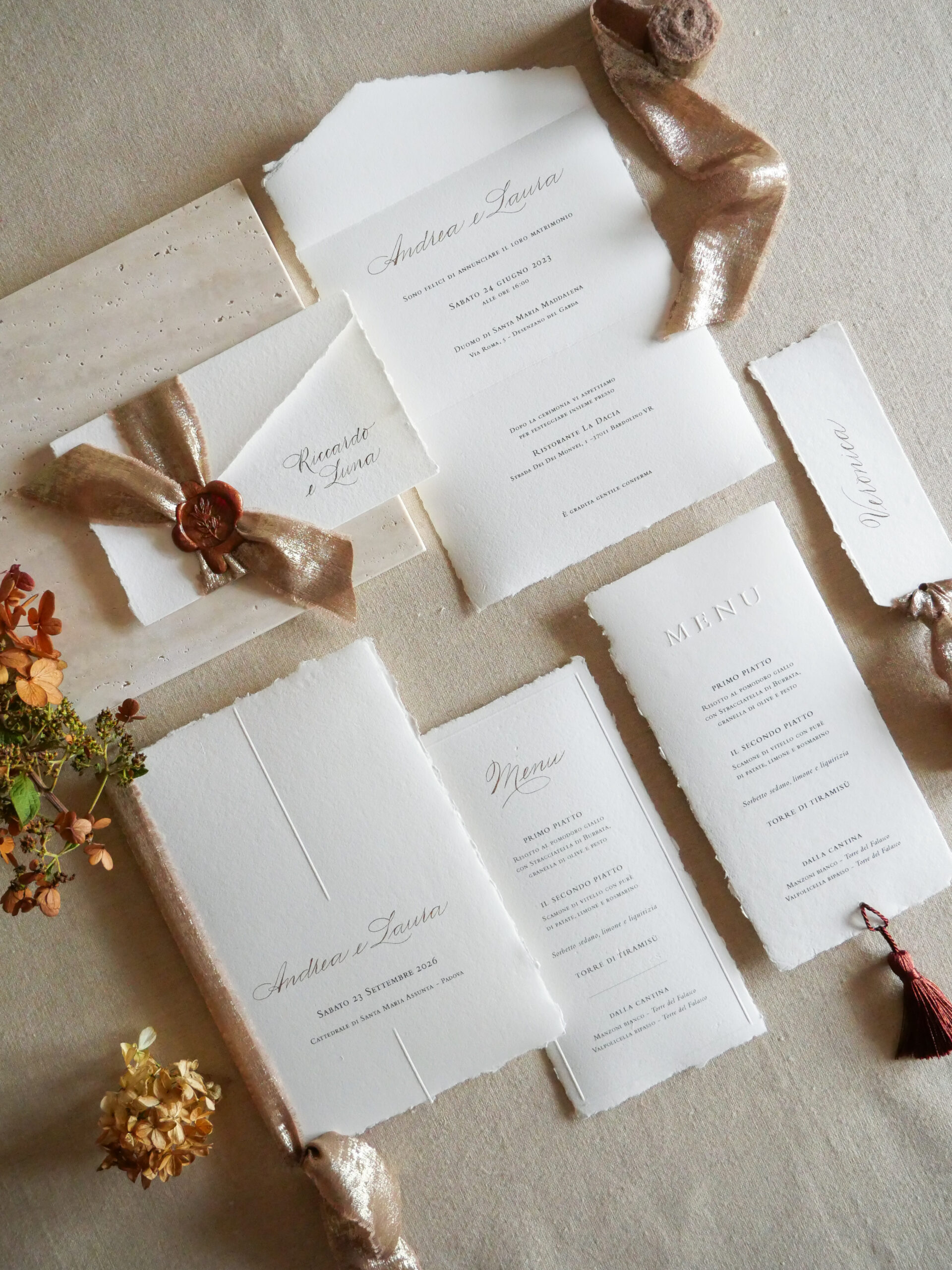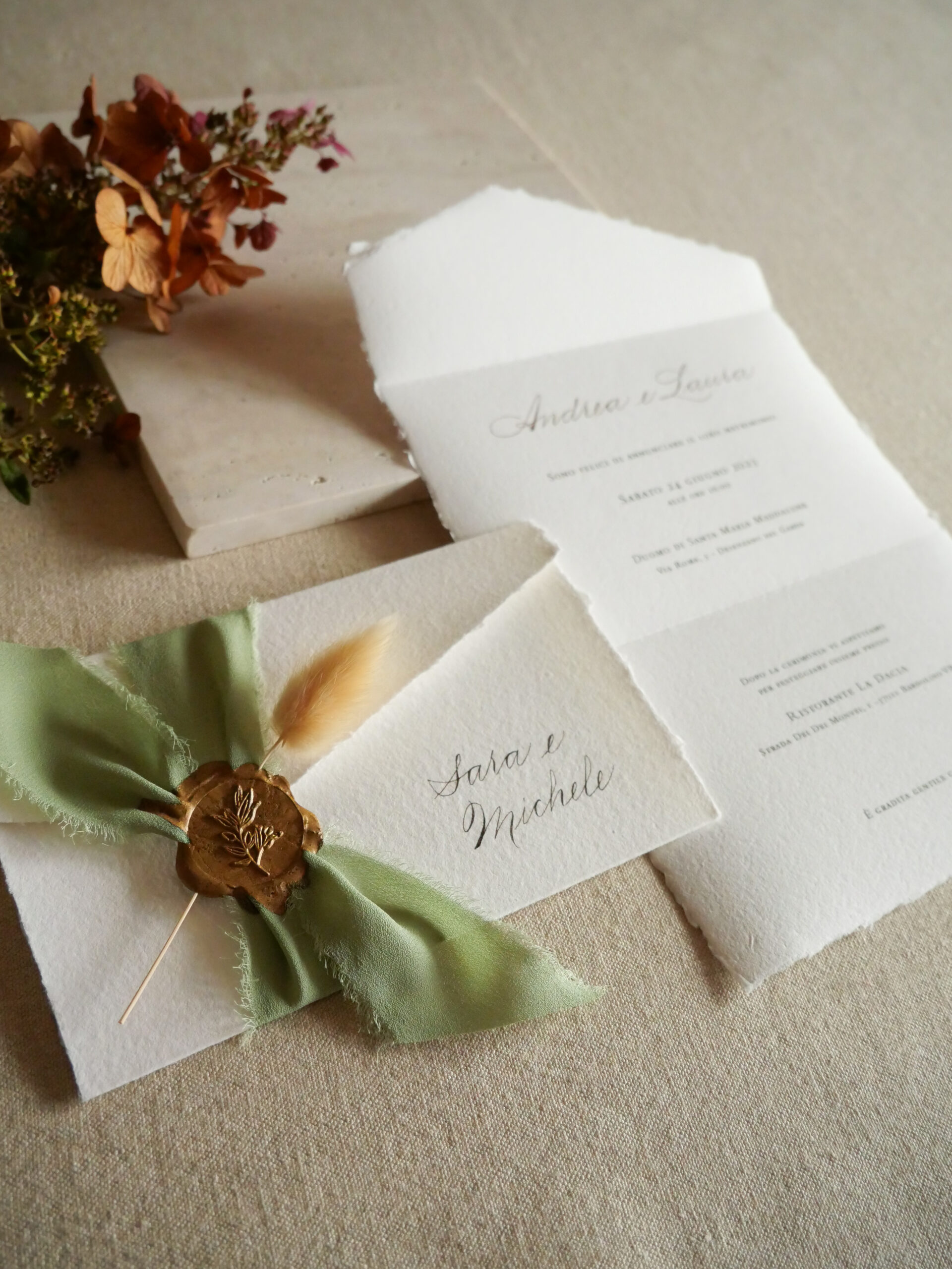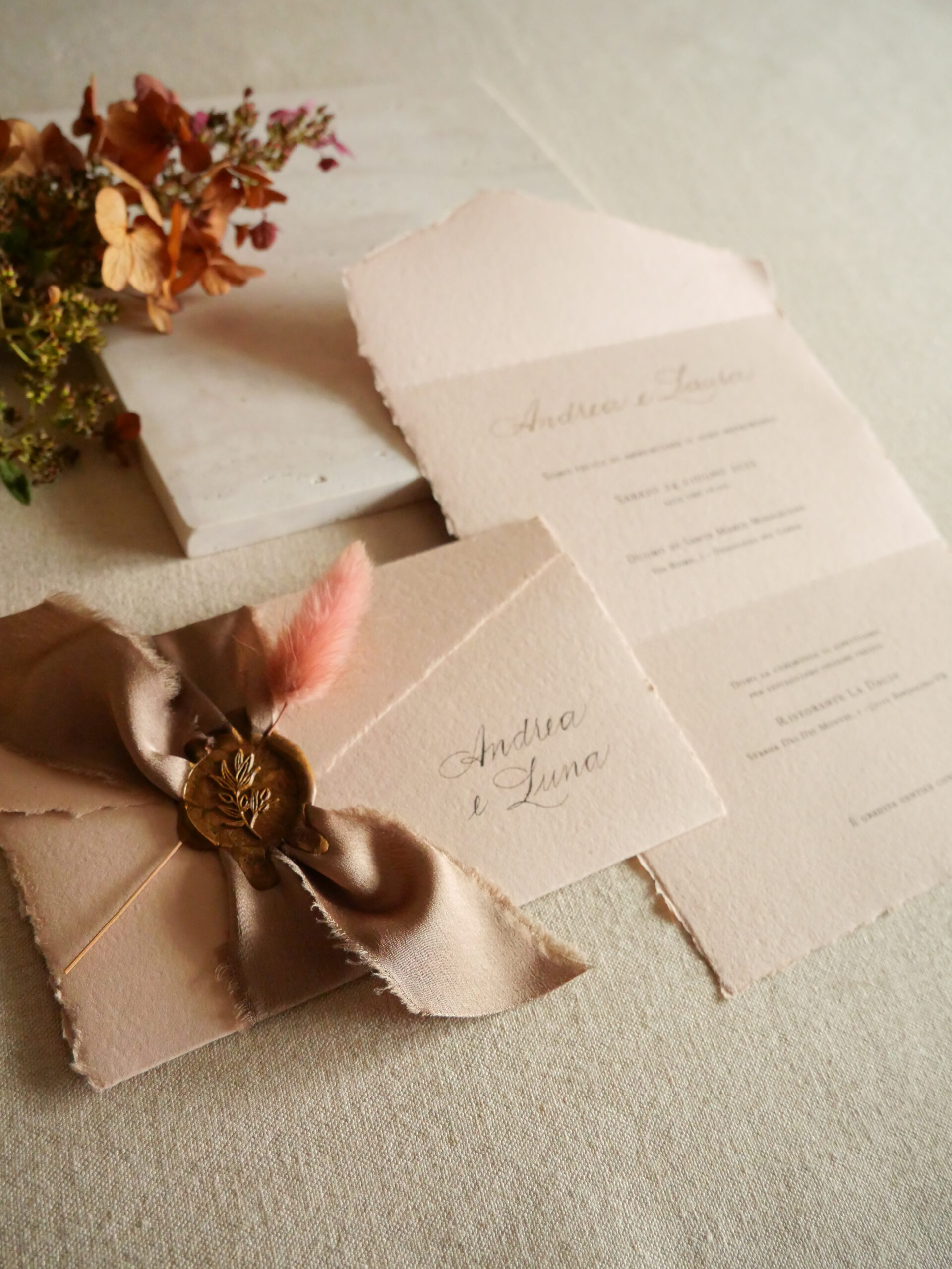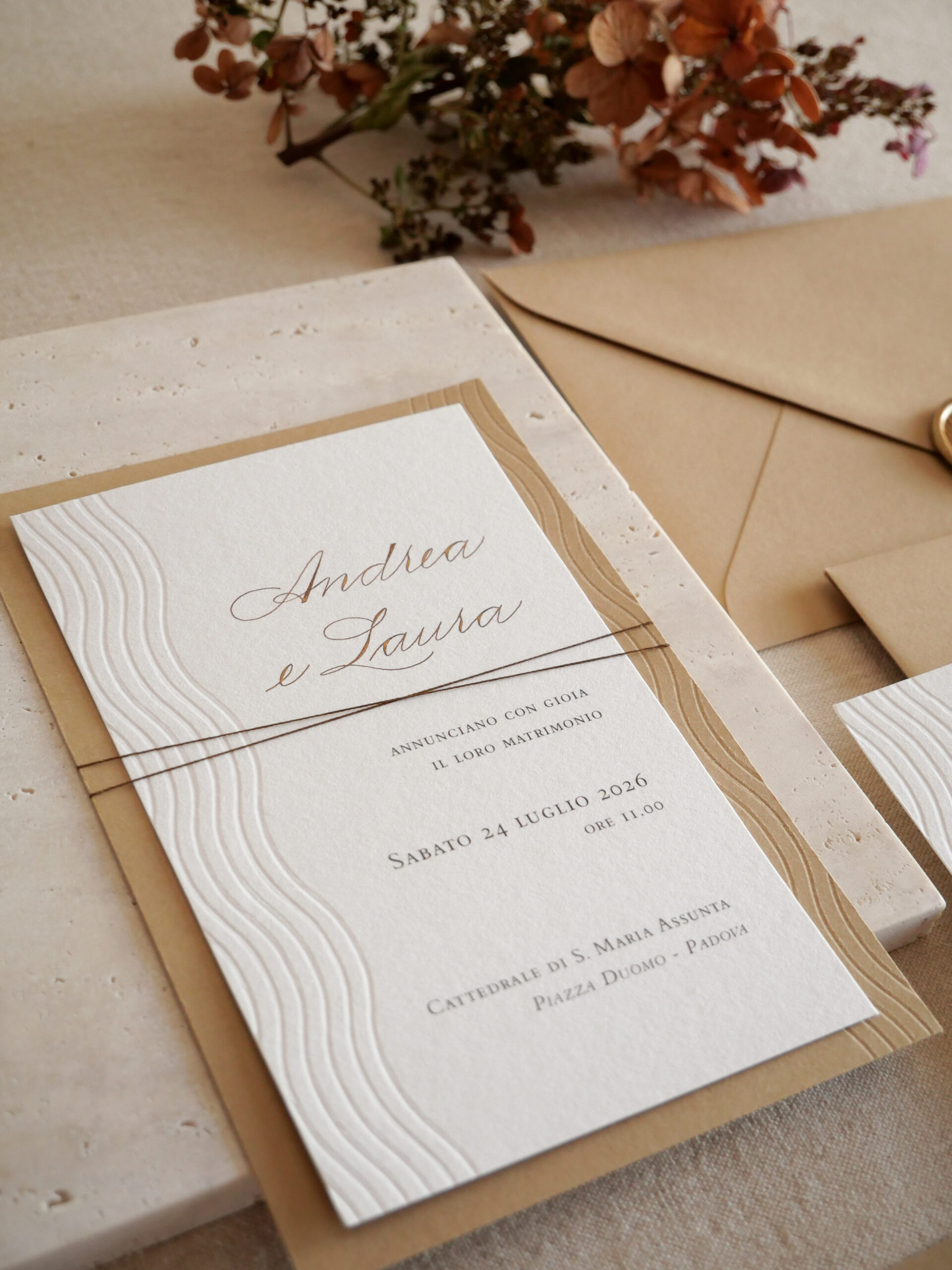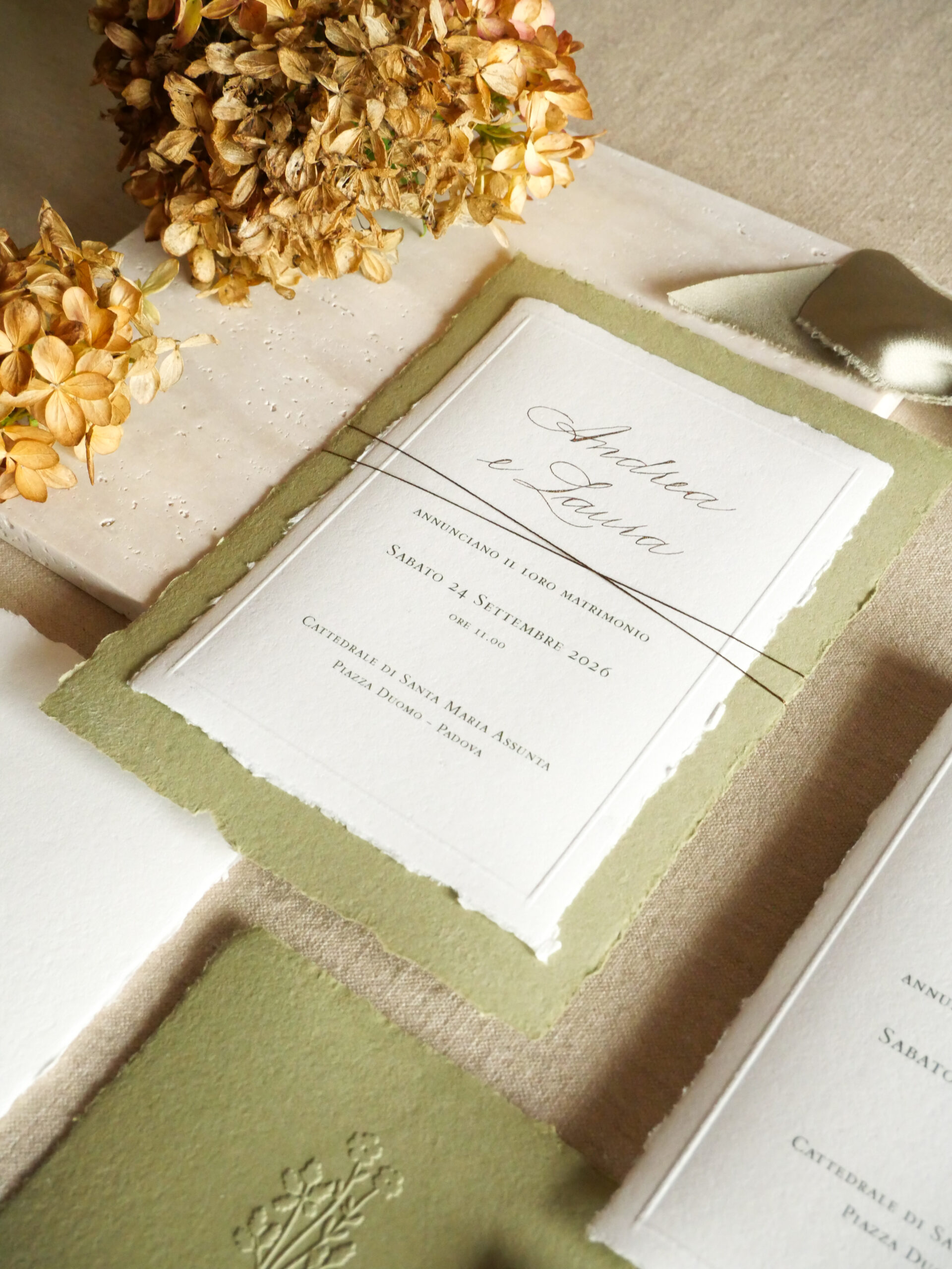 - La LINEA MATERIA, in cui la carta si fa viva e tattile. Ogni invito unisce carte e buste artigianali, realizzate a mano dalla cartiera italiana Mc Paper. Per chi ama la poesia delle imperfezioni e il fascino di un dettaglio dal sapore unico.
