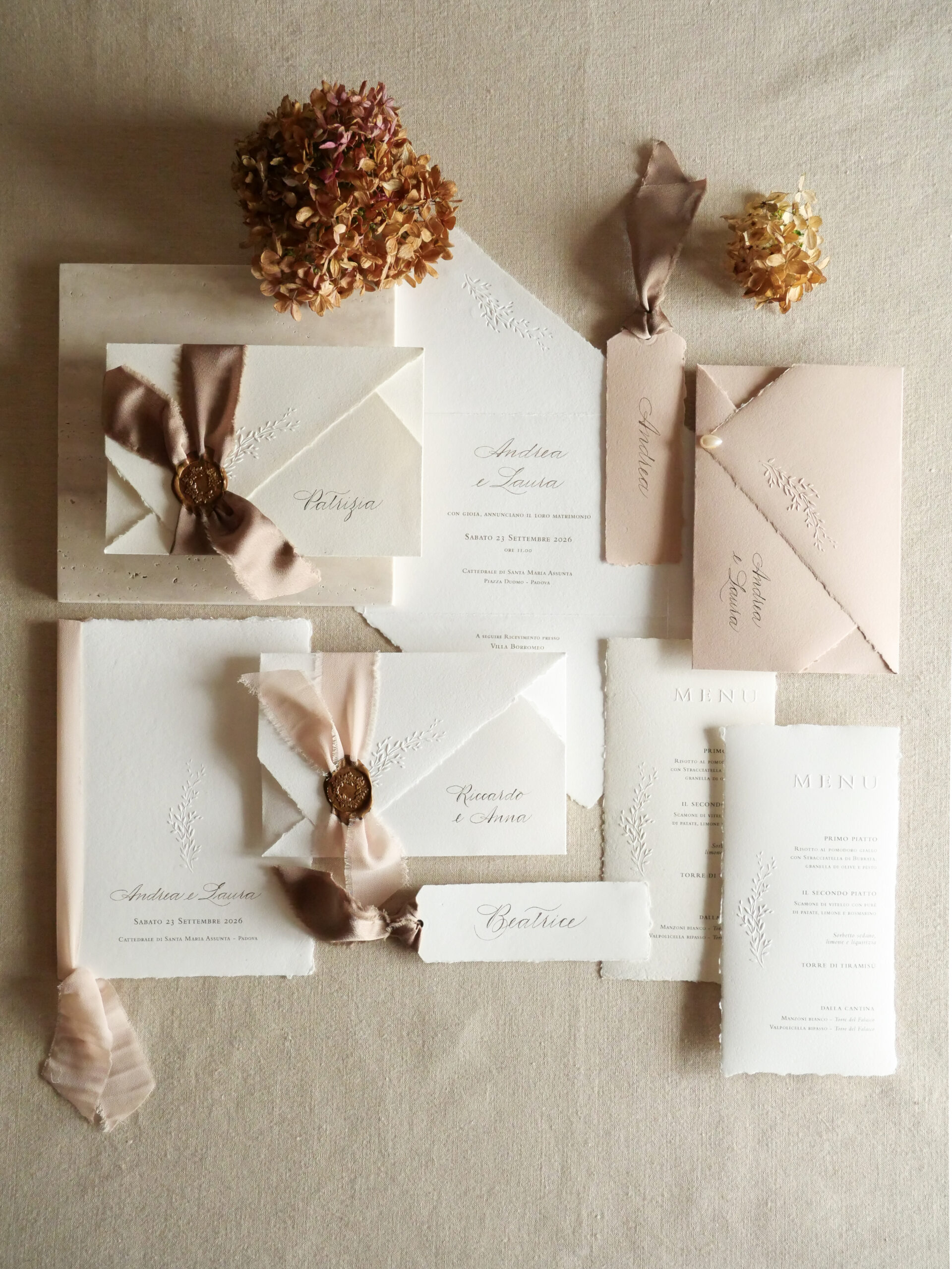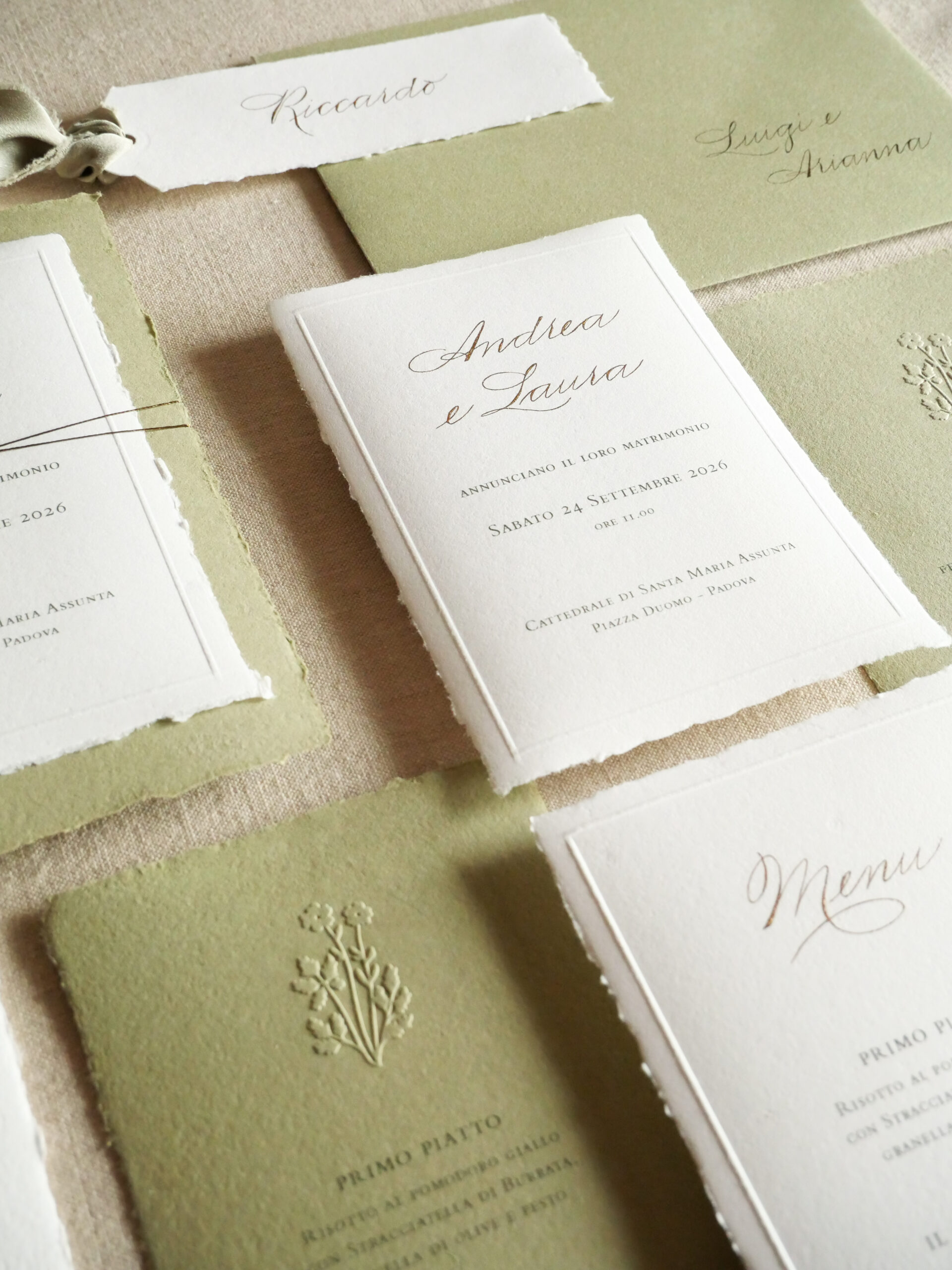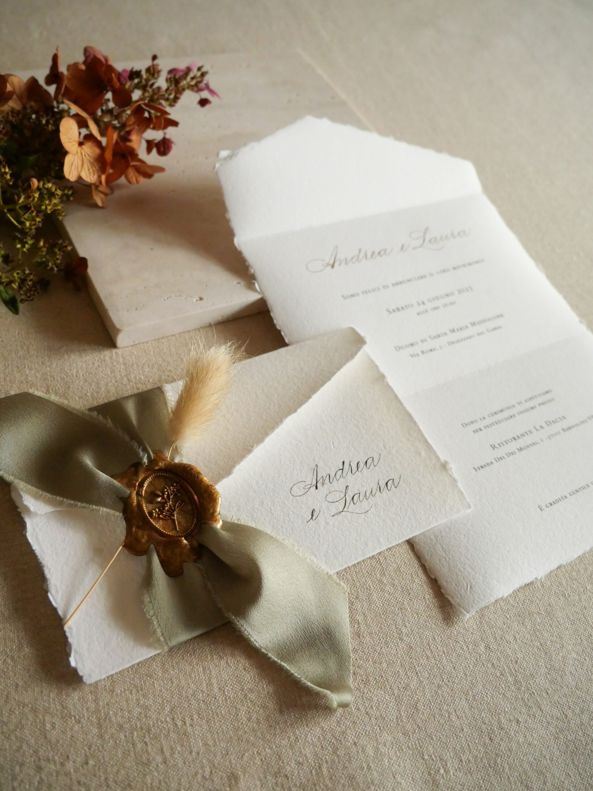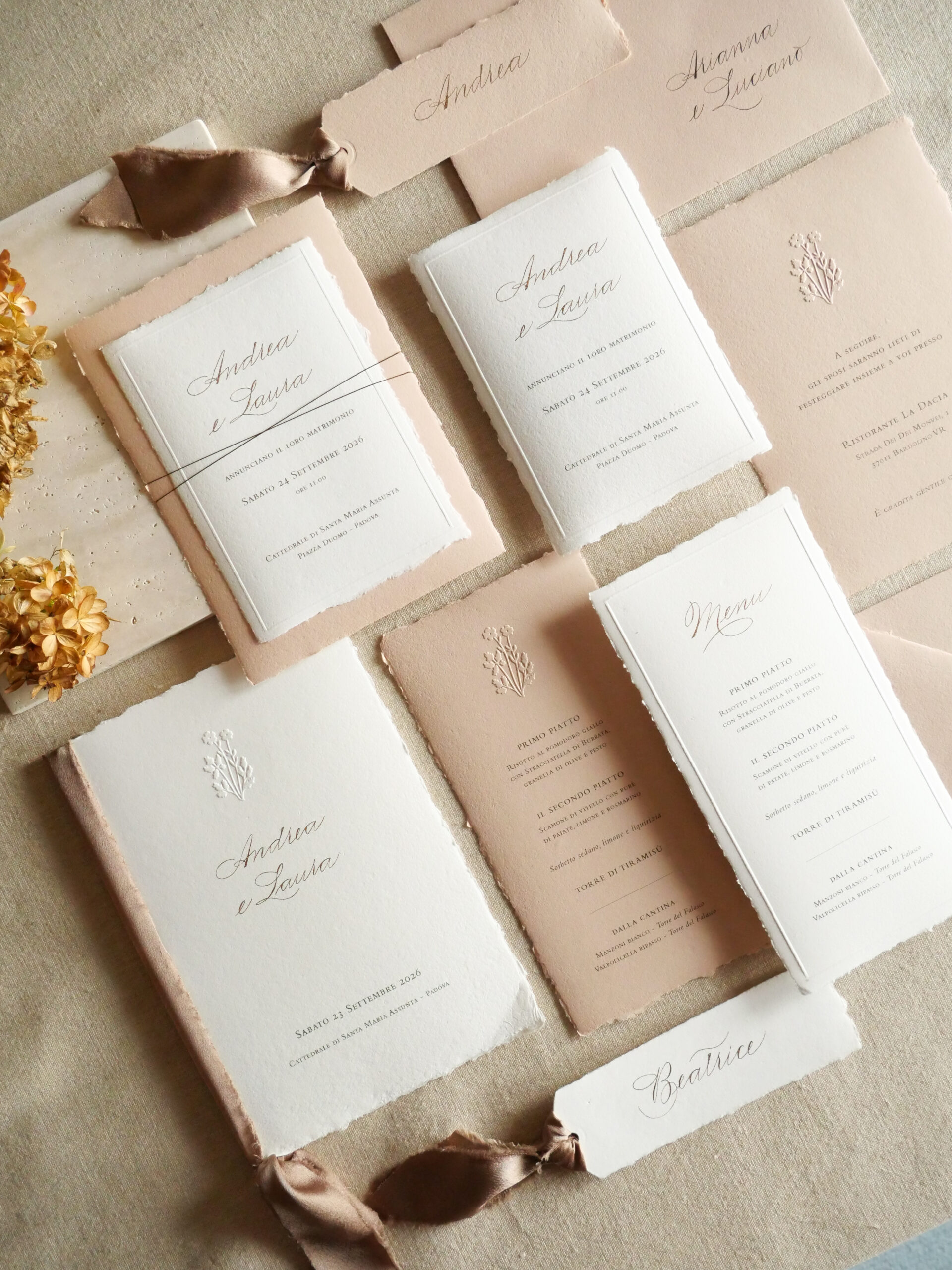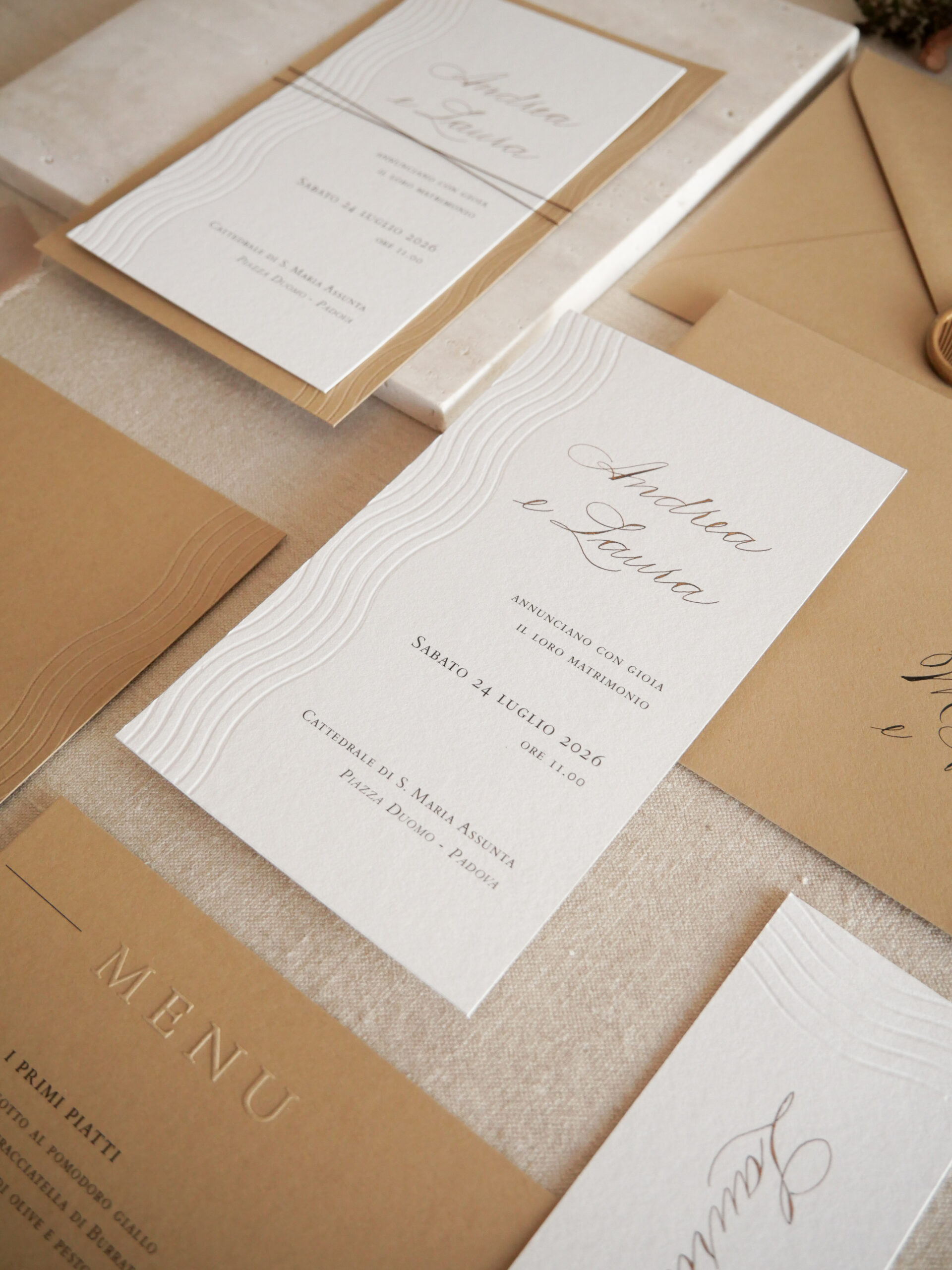 - La LINEA MATERIA, in cui la carta si fa viva e tattile. Ogni invito unisce carte e buste artigianali, realizzate a mano dalla cartiera italiana Mc Paper. Per chi ama la poesia delle imperfezioni e il fascino di un dettaglio dal sapore unico.