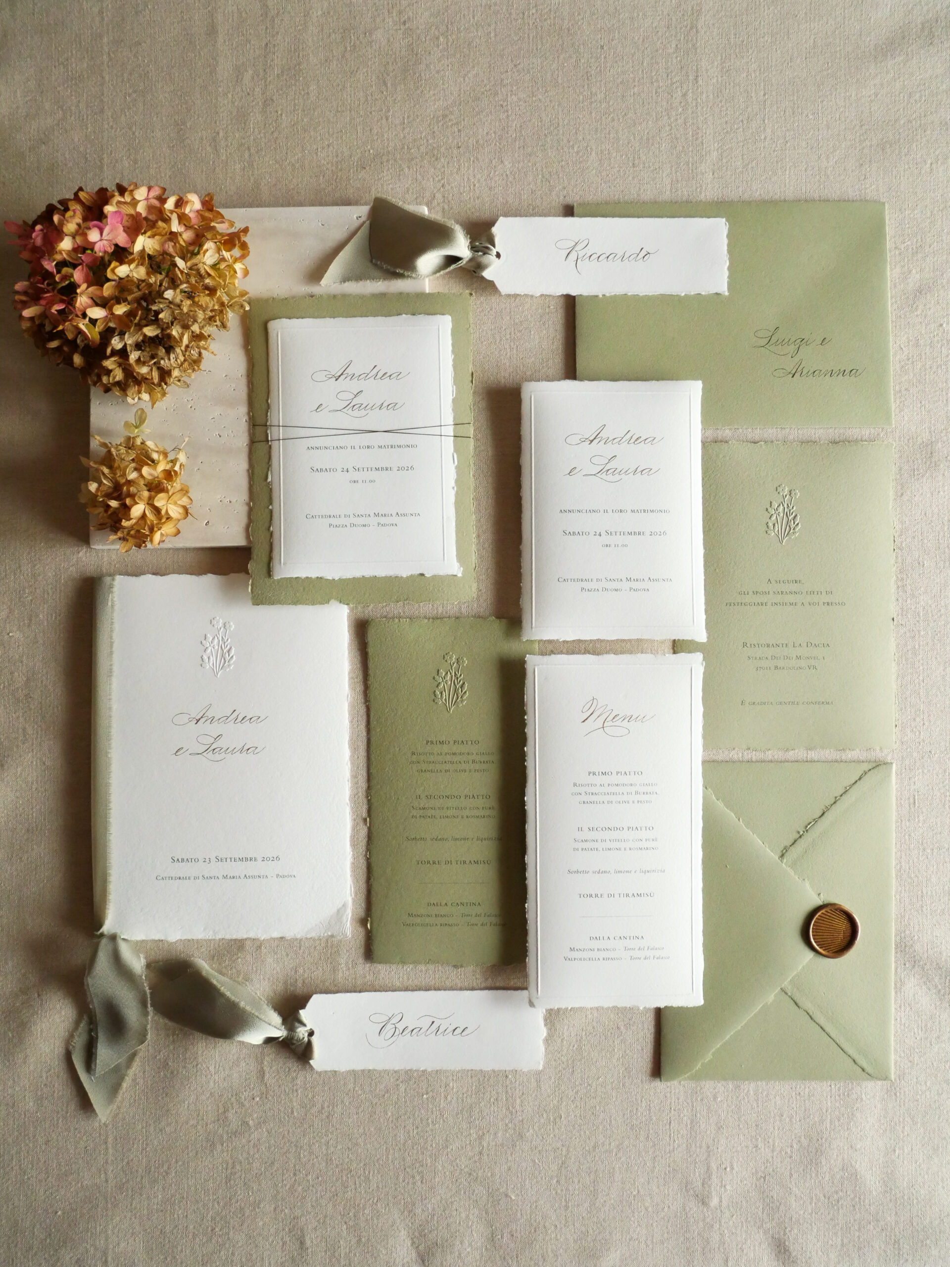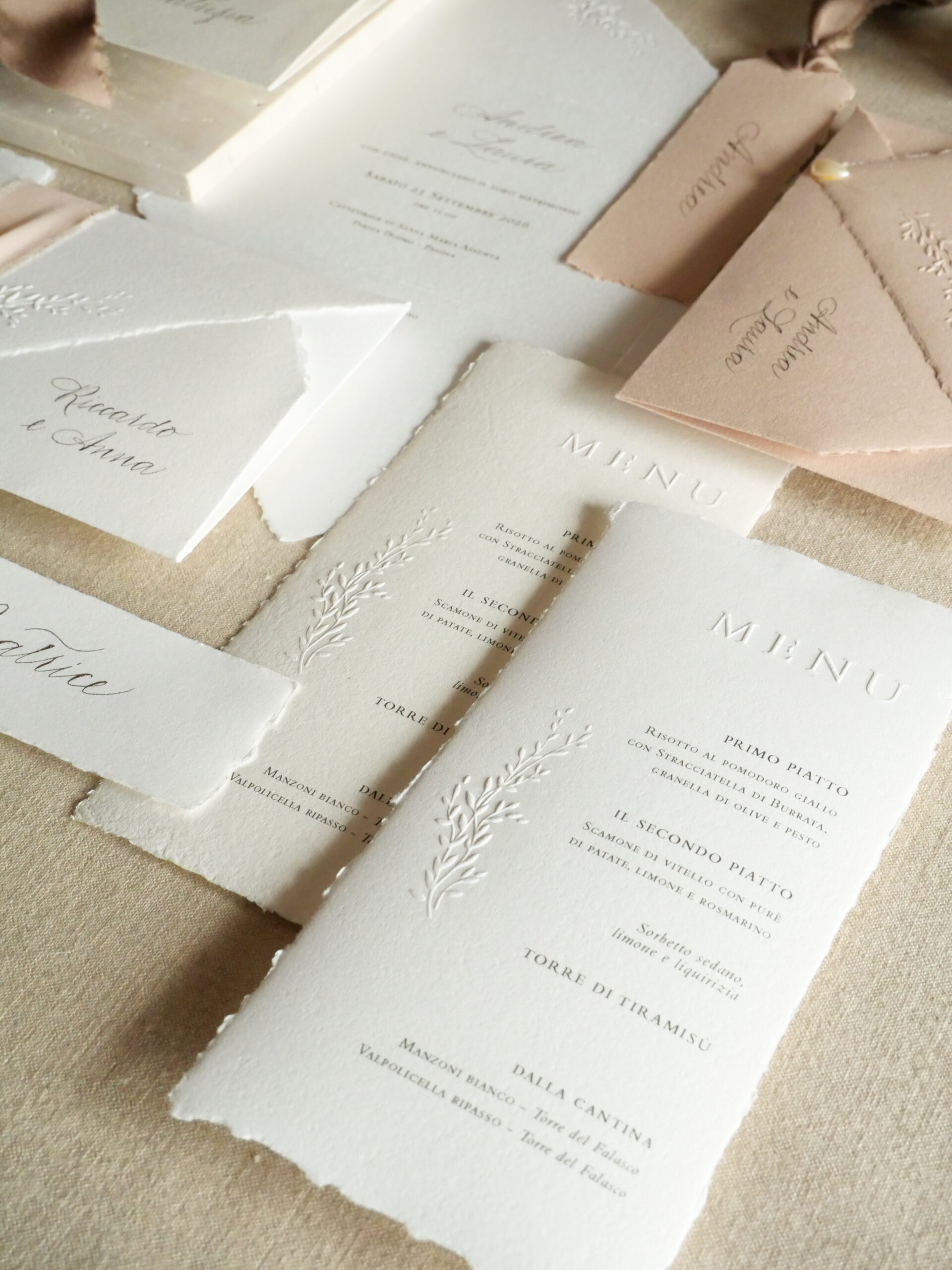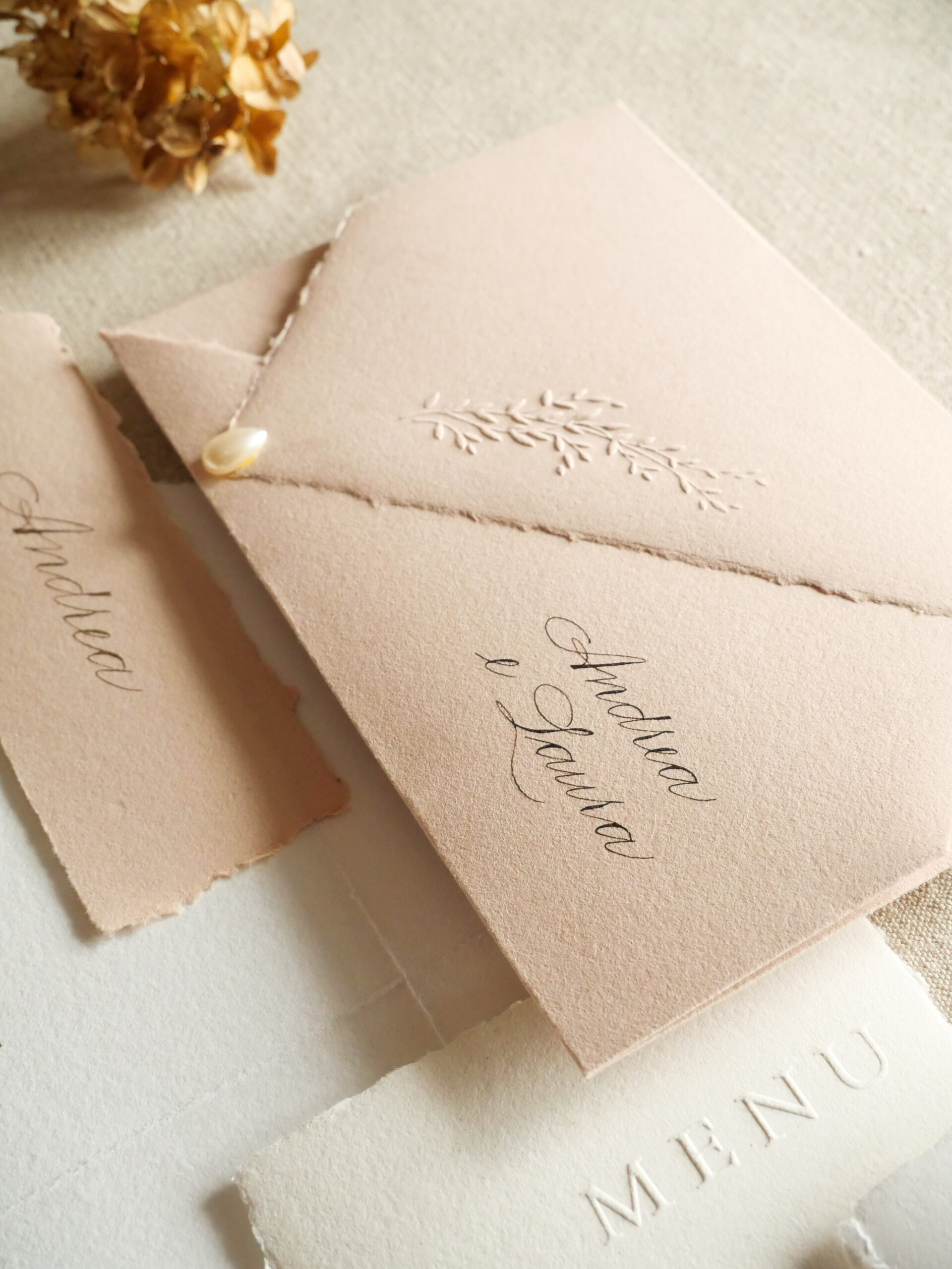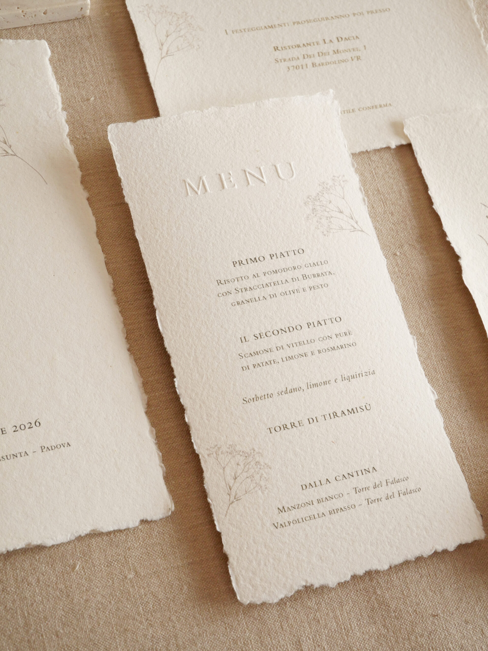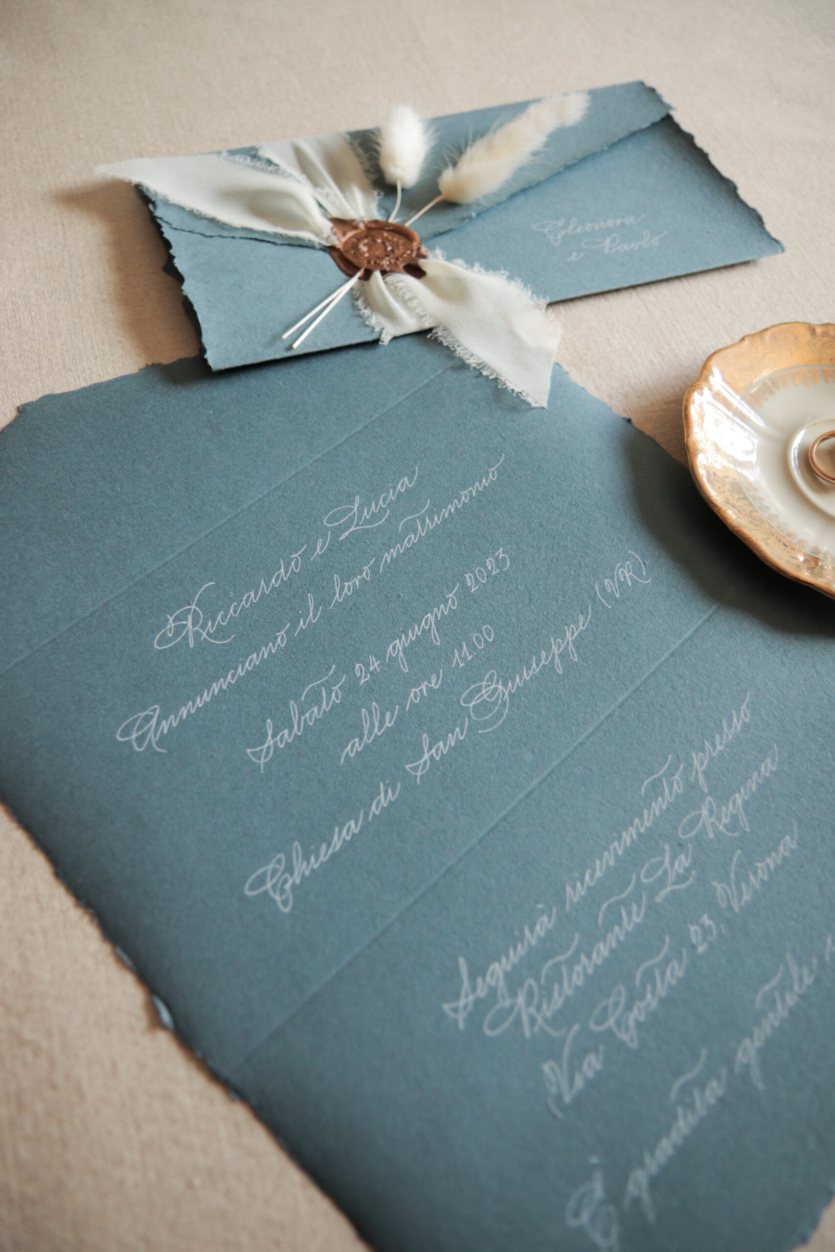 - La LINEA MATERIA, in cui la carta si fa viva e tattile. Ogni invito unisce carte e buste artigianali, realizzate a mano dalla cartiera italiana Mc Paper. Per chi ama la poesia delle imperfezioni e il fascino di un dettaglio dal sapore unico.