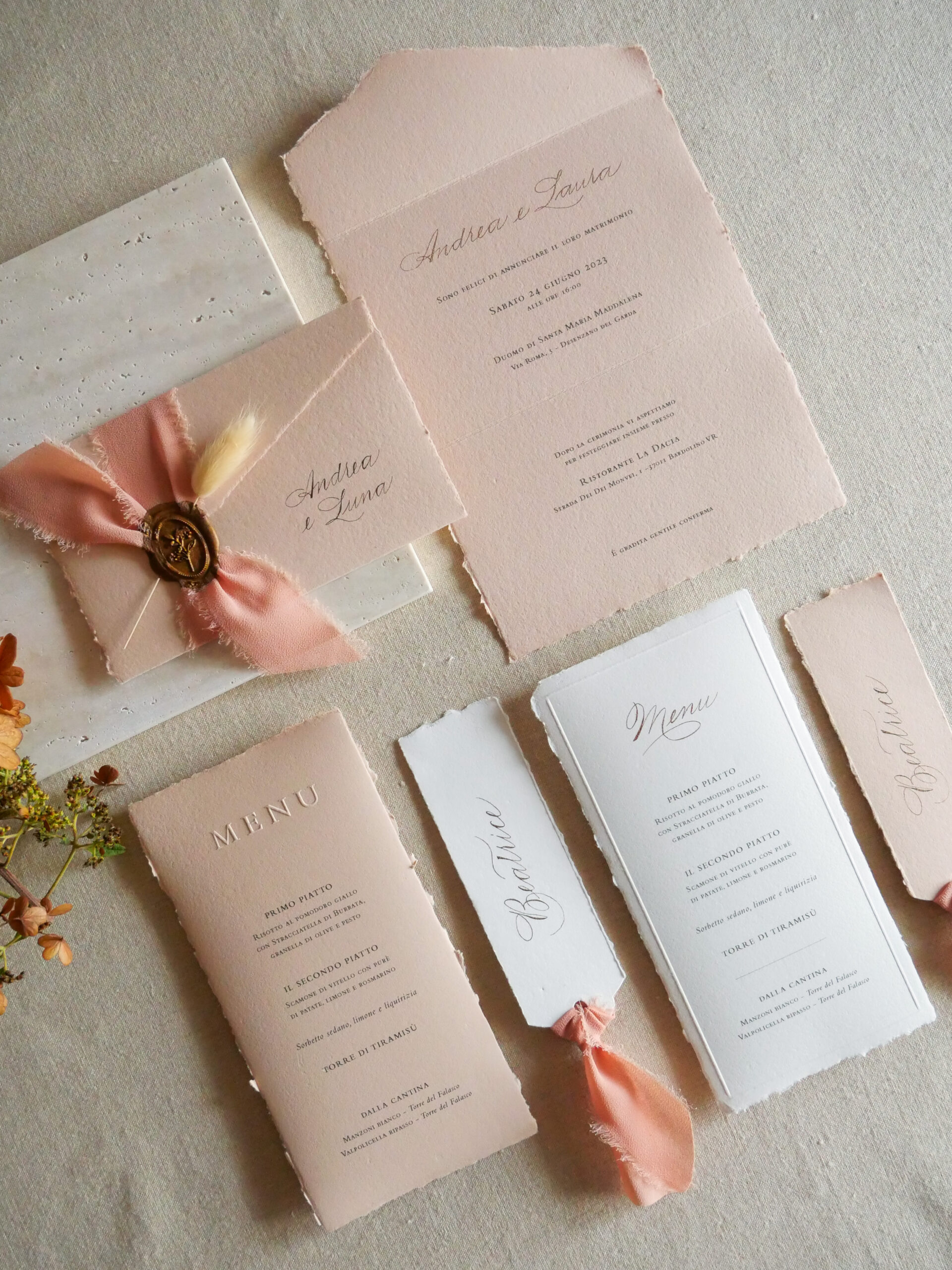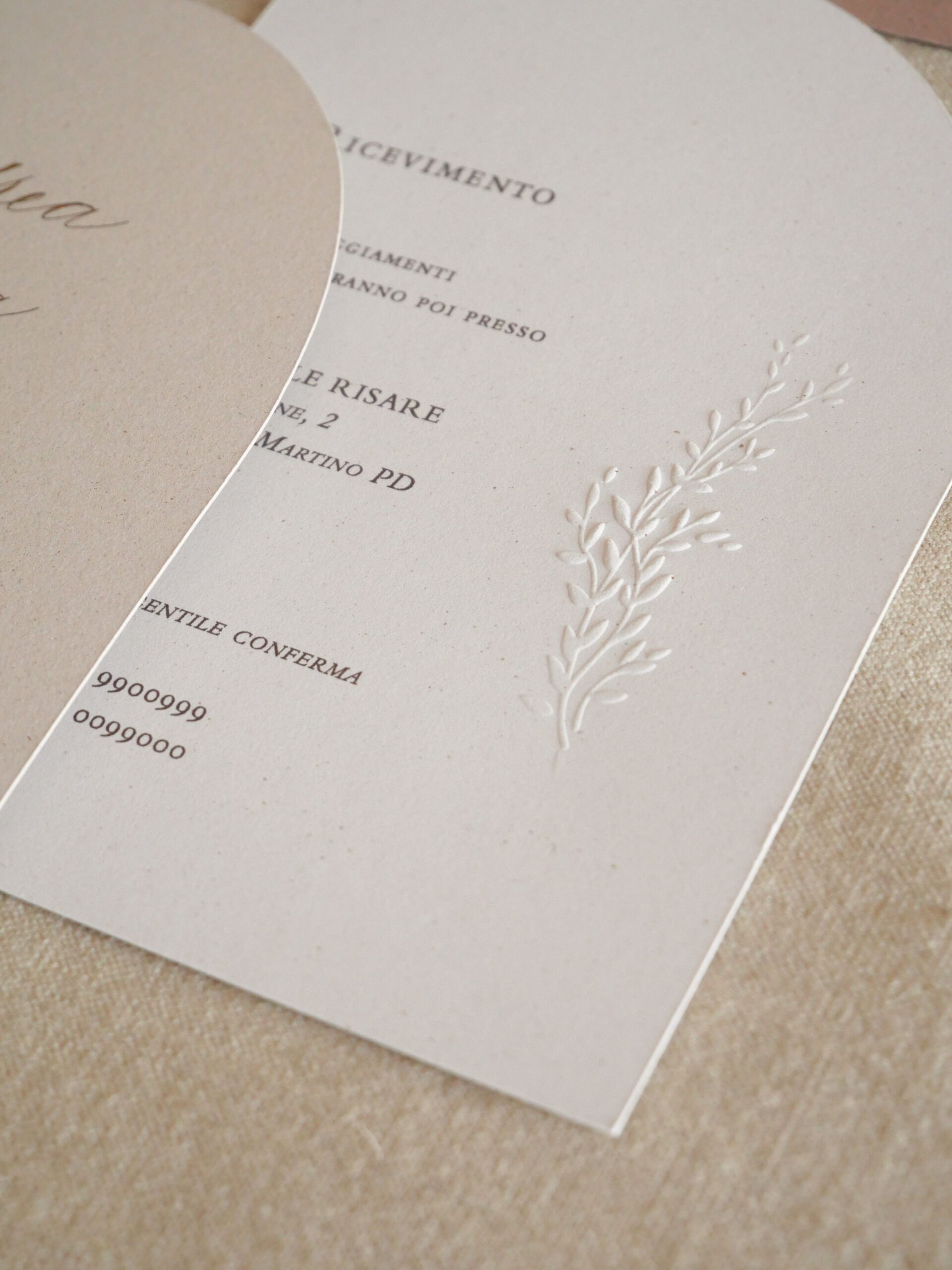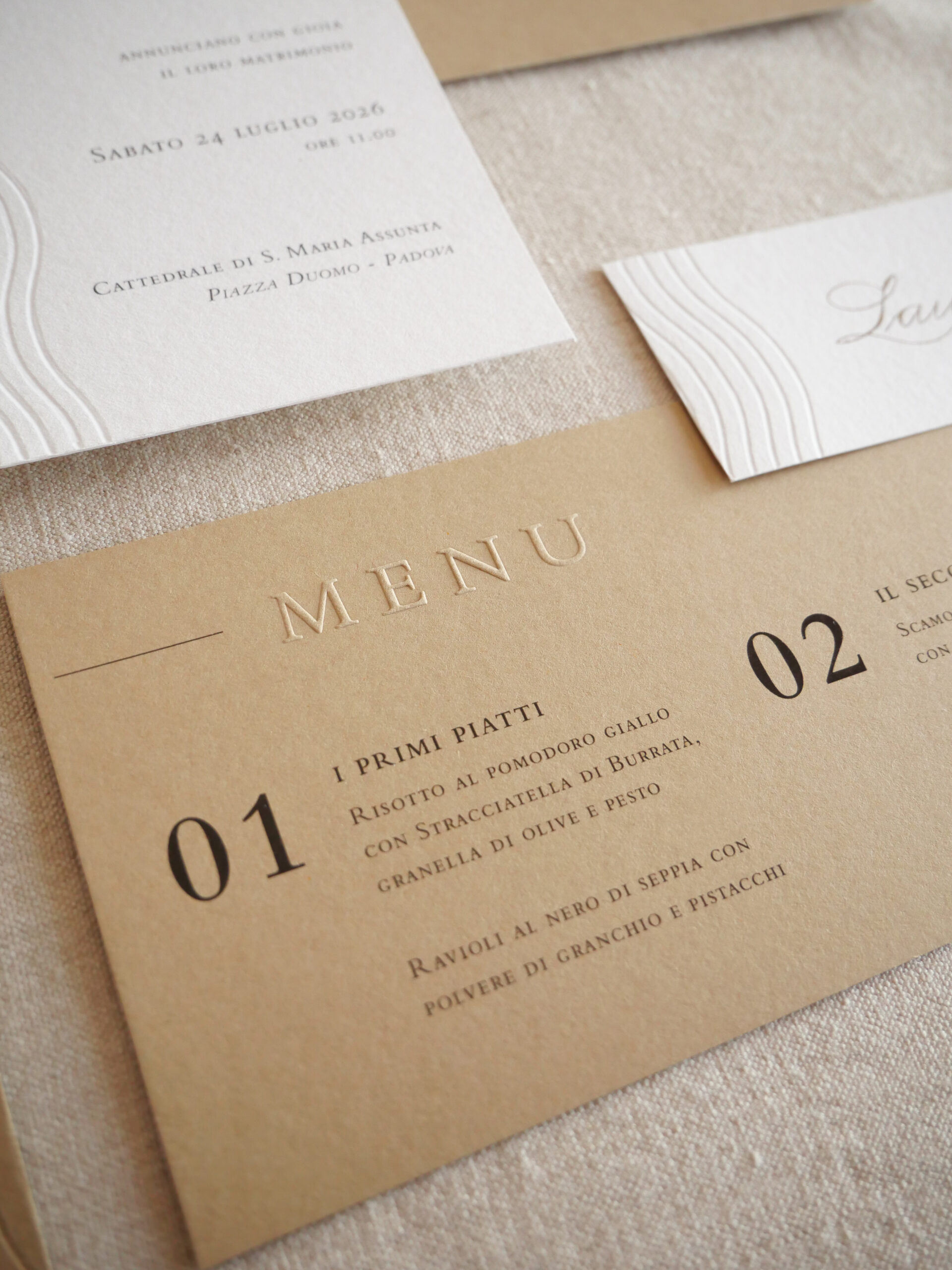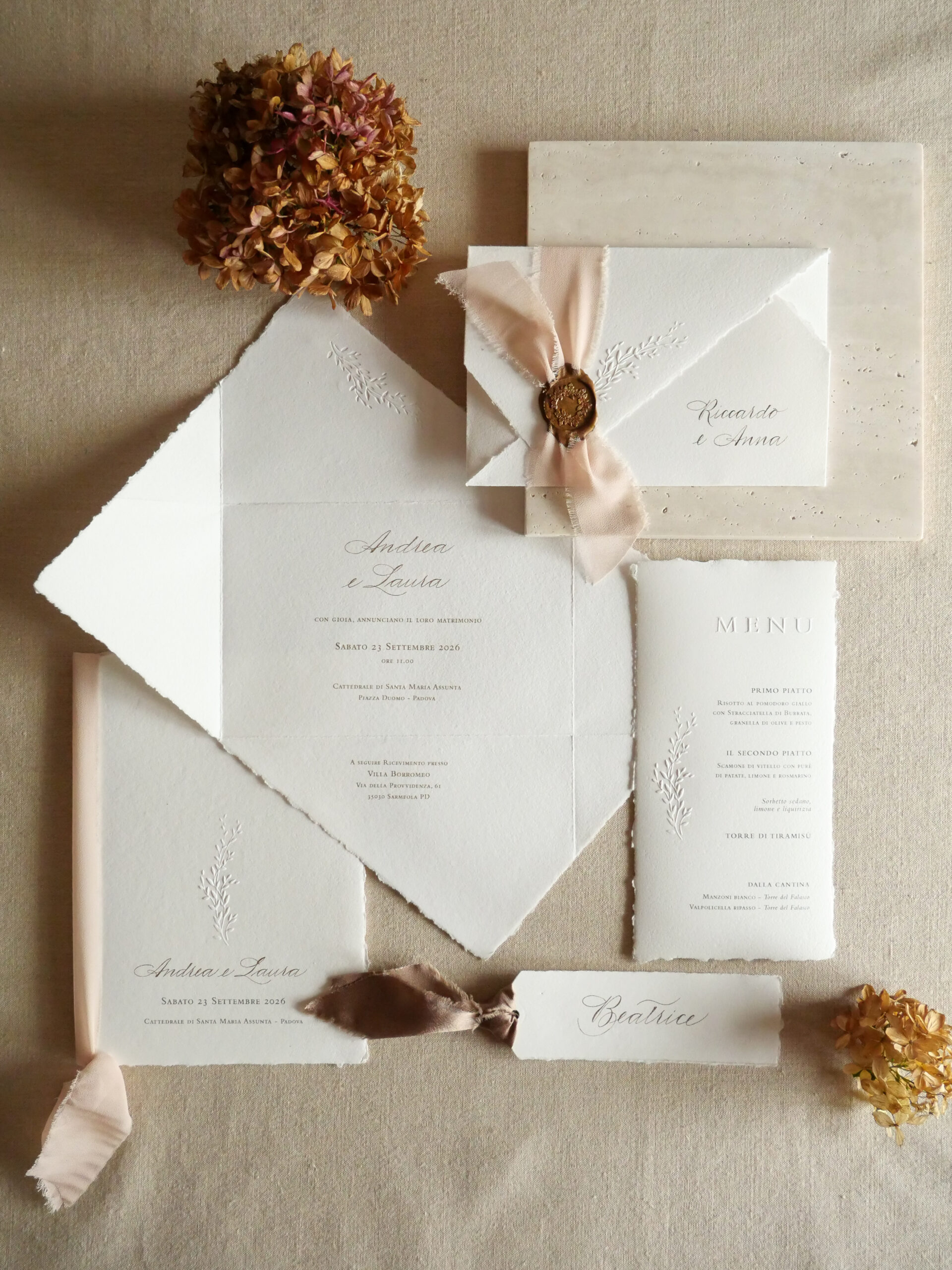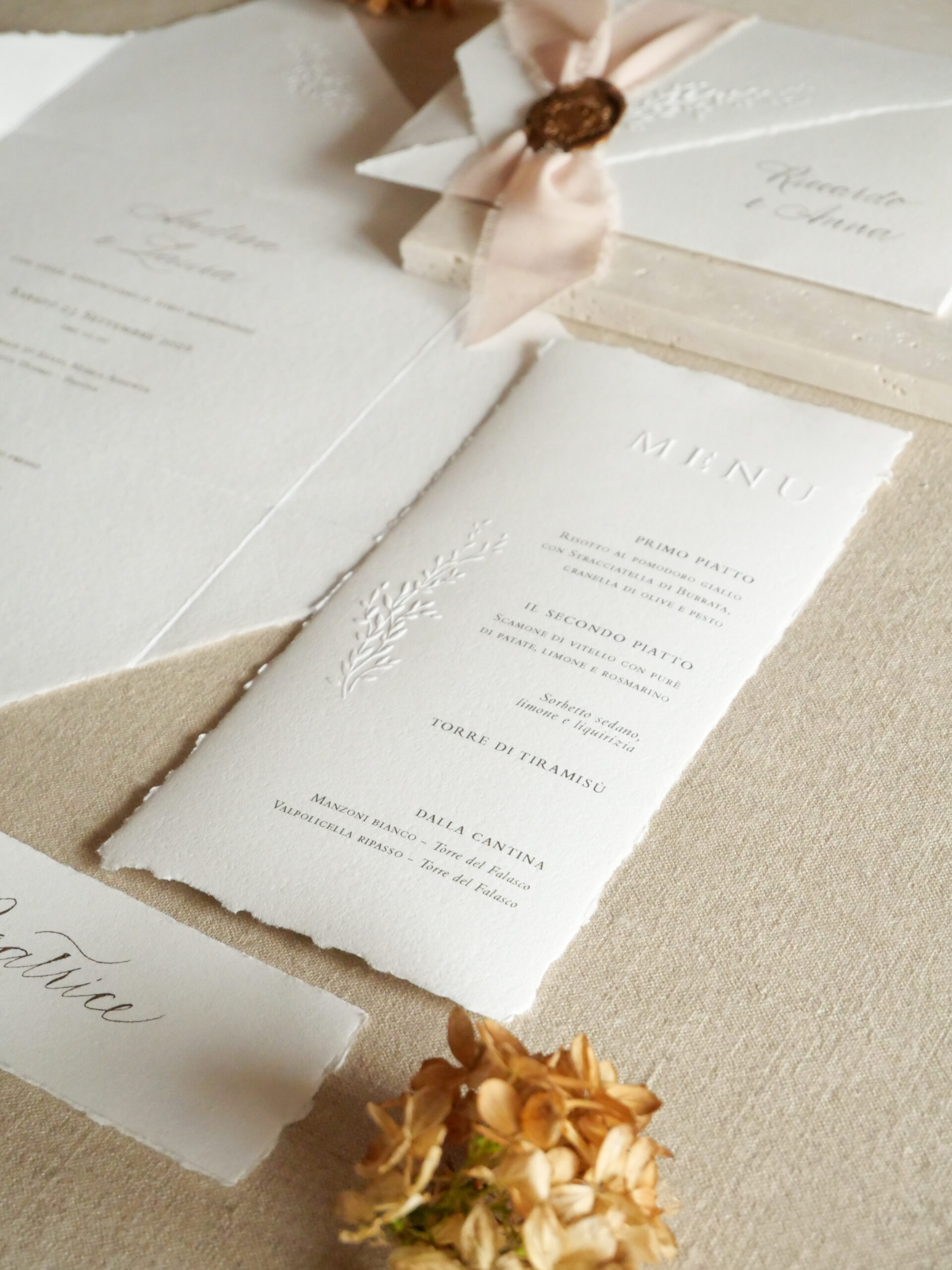 - La LINEA MATERIA, in cui la carta si fa viva e tattile. Ogni invito unisce carte e buste artigianali, realizzate a mano dalla cartiera italiana Mc Paper. Per chi ama la poesia delle imperfezioni e il fascino di un dettaglio dal sapore unico.