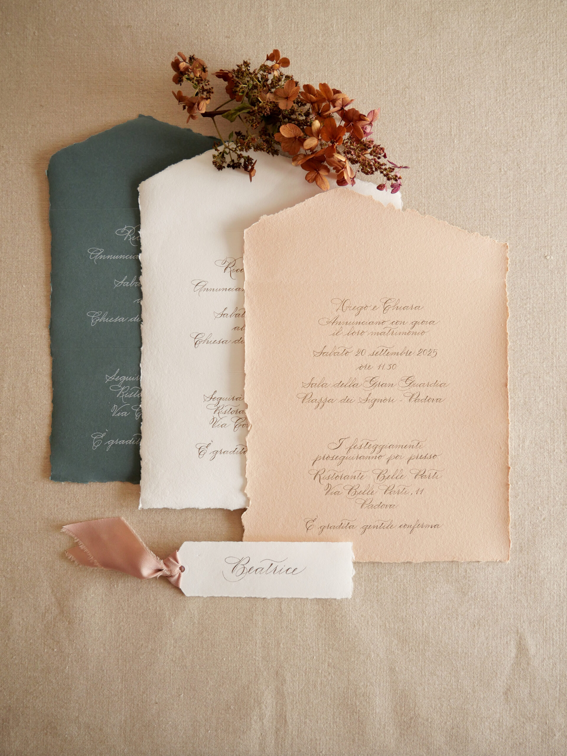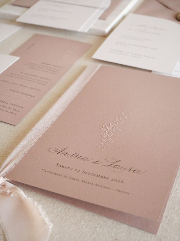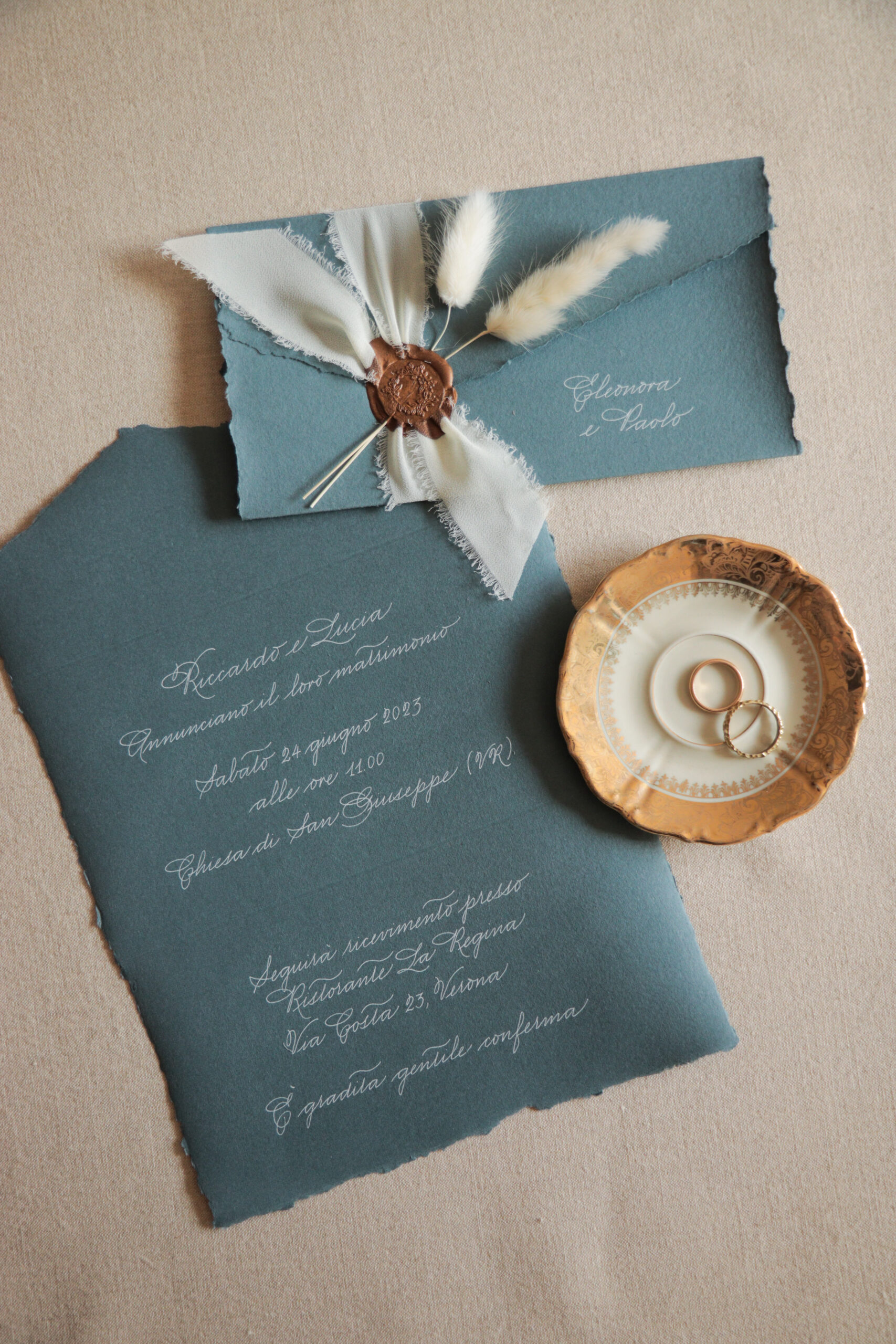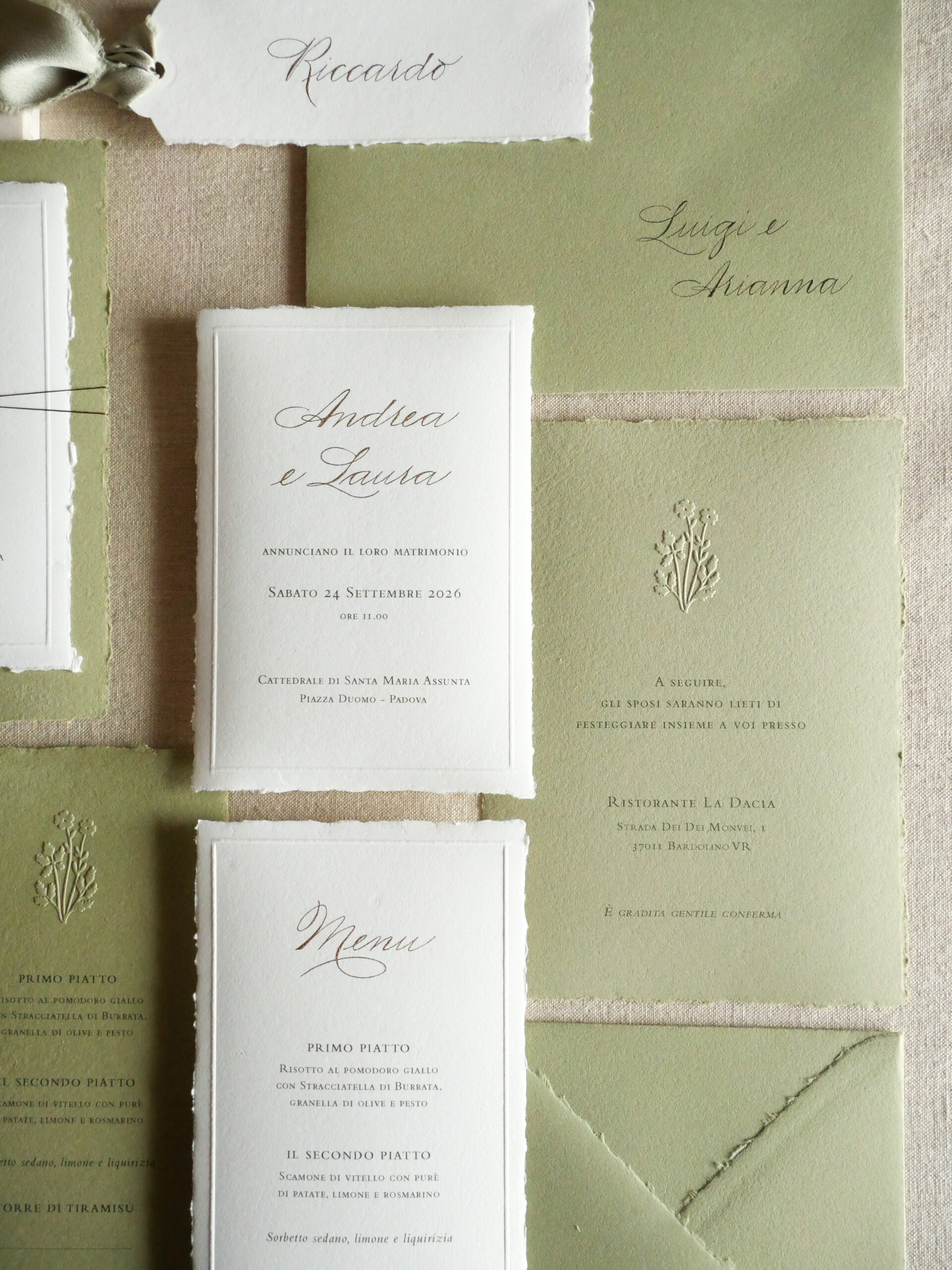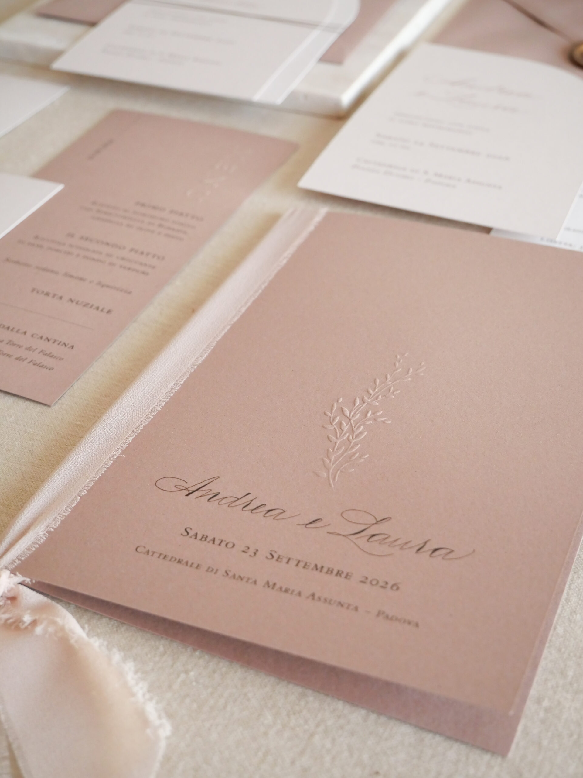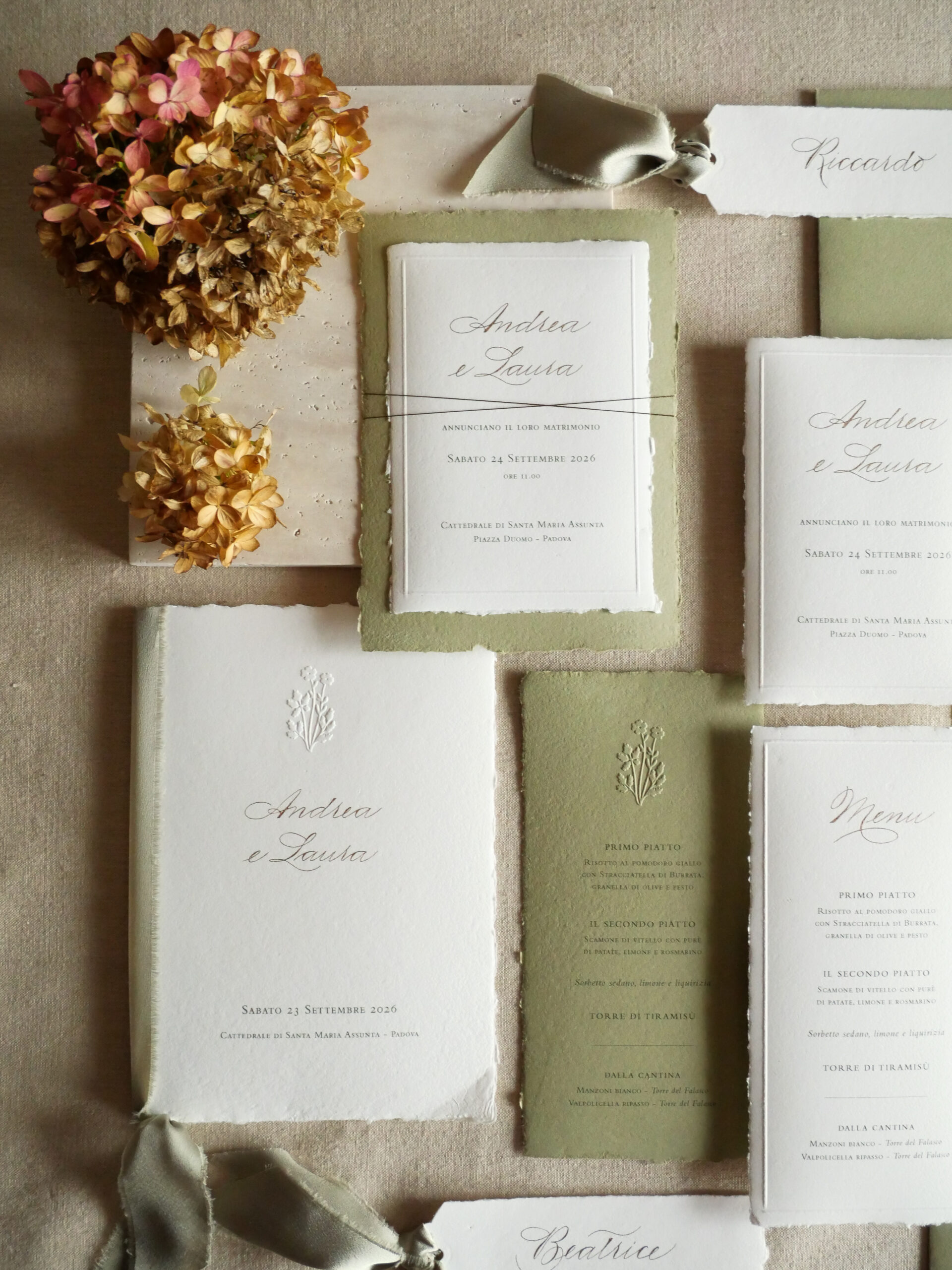 - La LINEA MATERIA, in cui la carta si fa viva e tattile. Ogni invito unisce carte e buste artigianali, realizzate a mano dalla cartiera italiana Mc Paper. Per chi ama la poesia delle imperfezioni e il fascino di un dettaglio dal sapore unico.