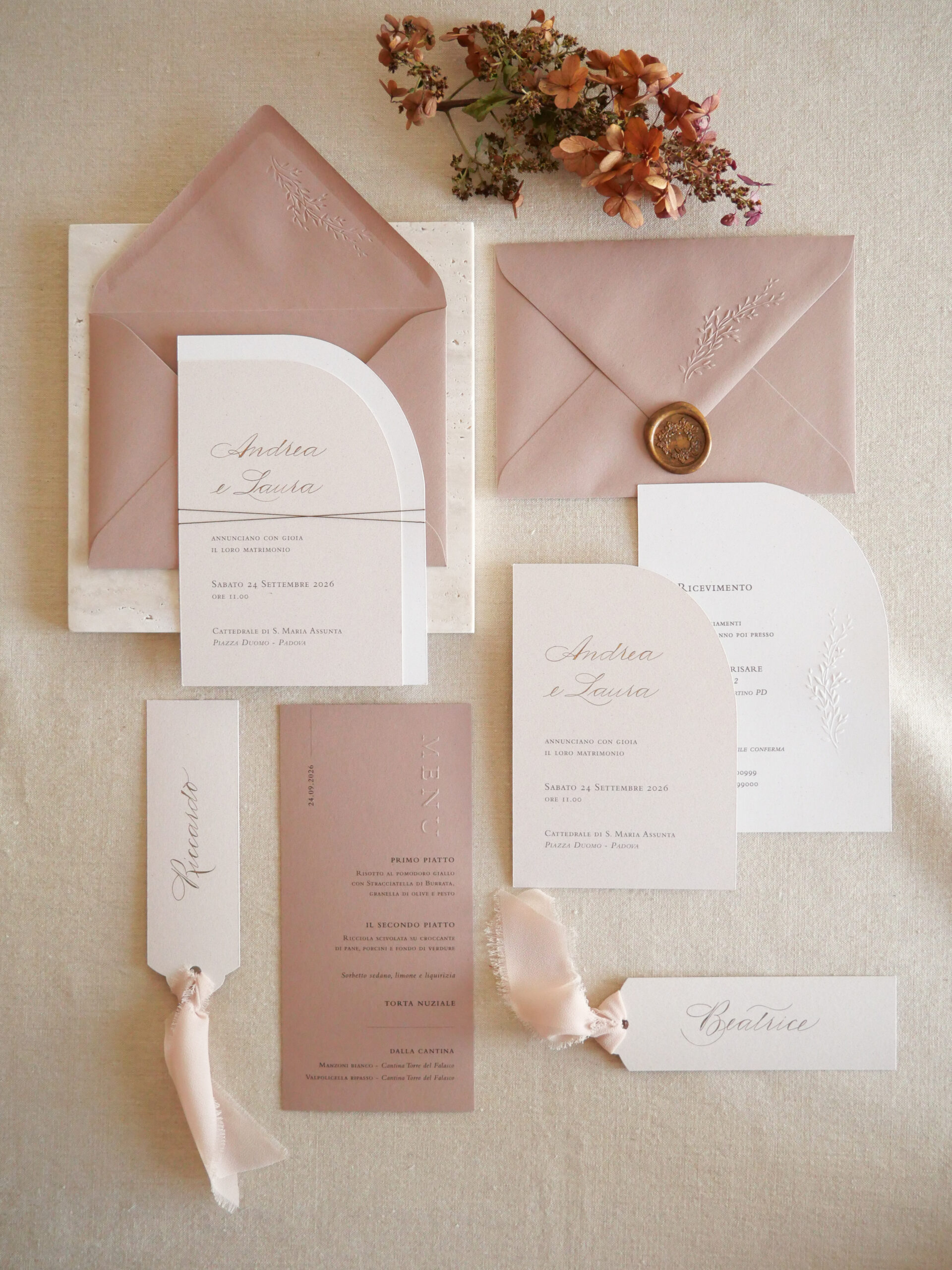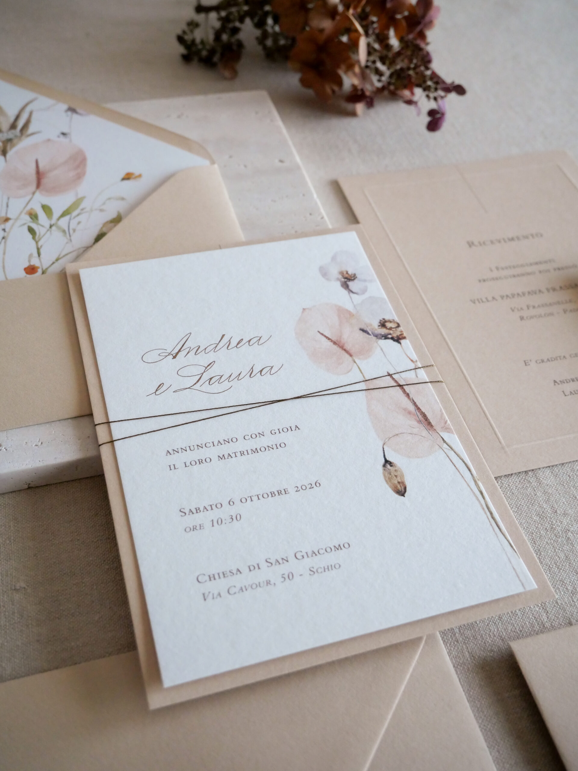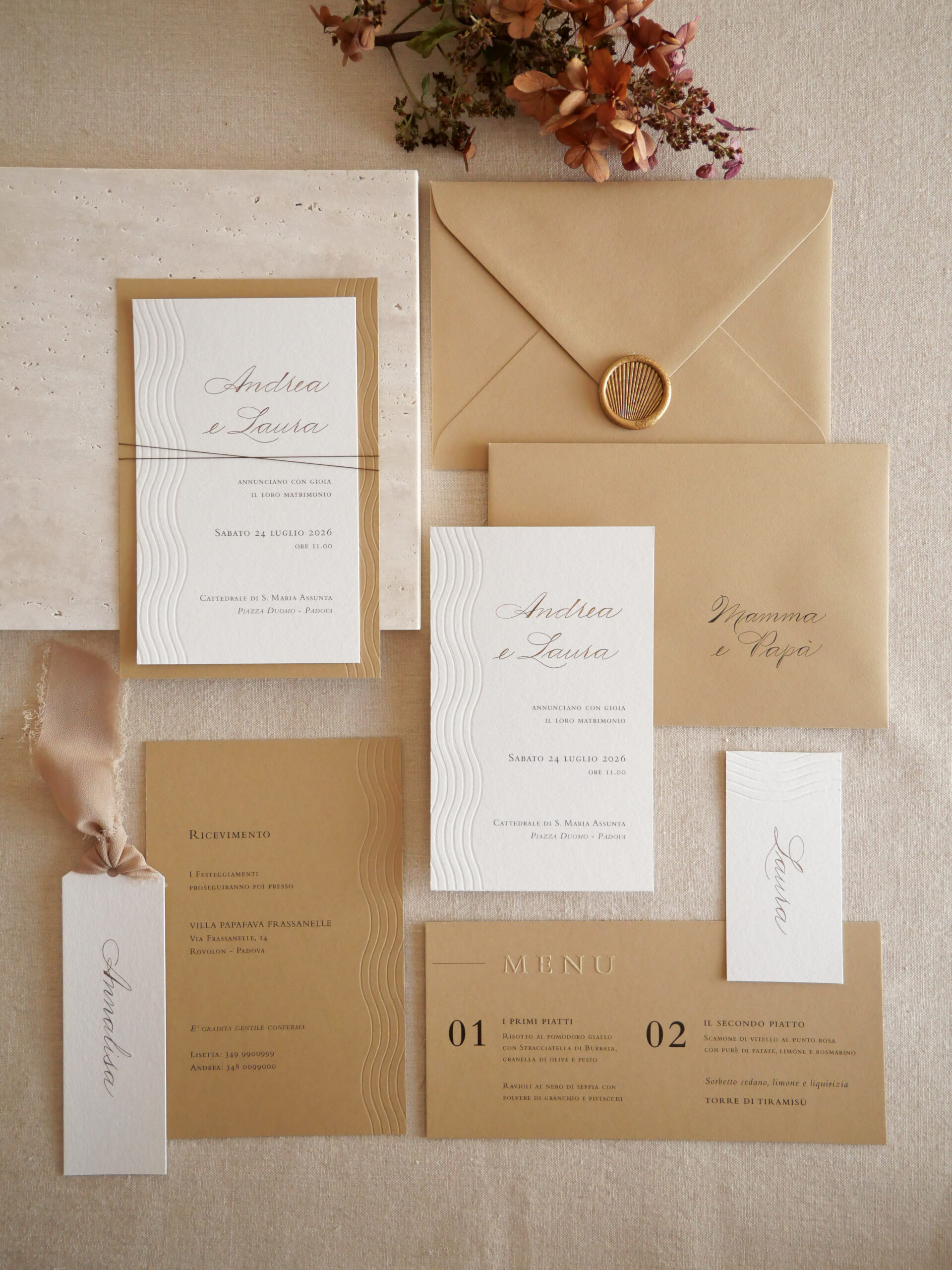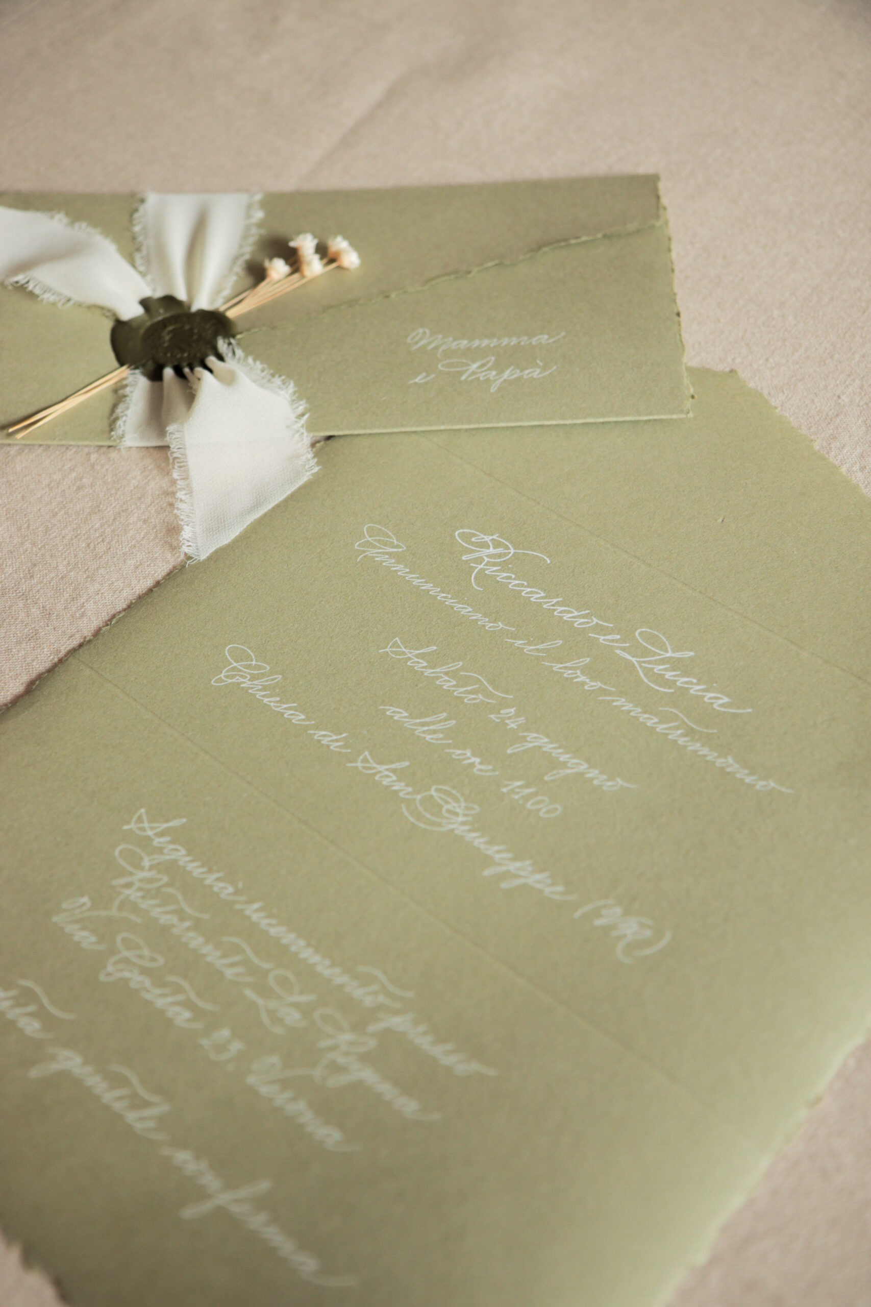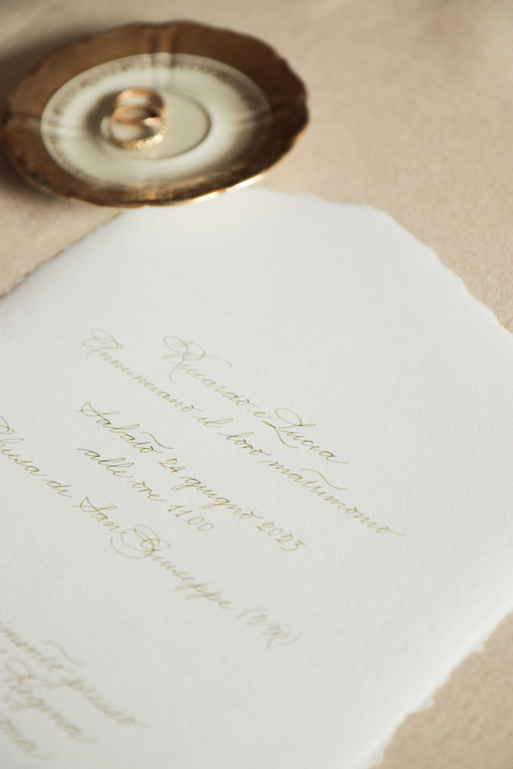- La LINEA MATERIA, in cui la carta si fa viva e tattile. Ogni invito unisce carte e buste artigianali, realizzate a mano dalla cartiera italiana Mc Paper. Per chi ama la poesia delle imperfezioni e il fascino di un dettaglio dal sapore unico.