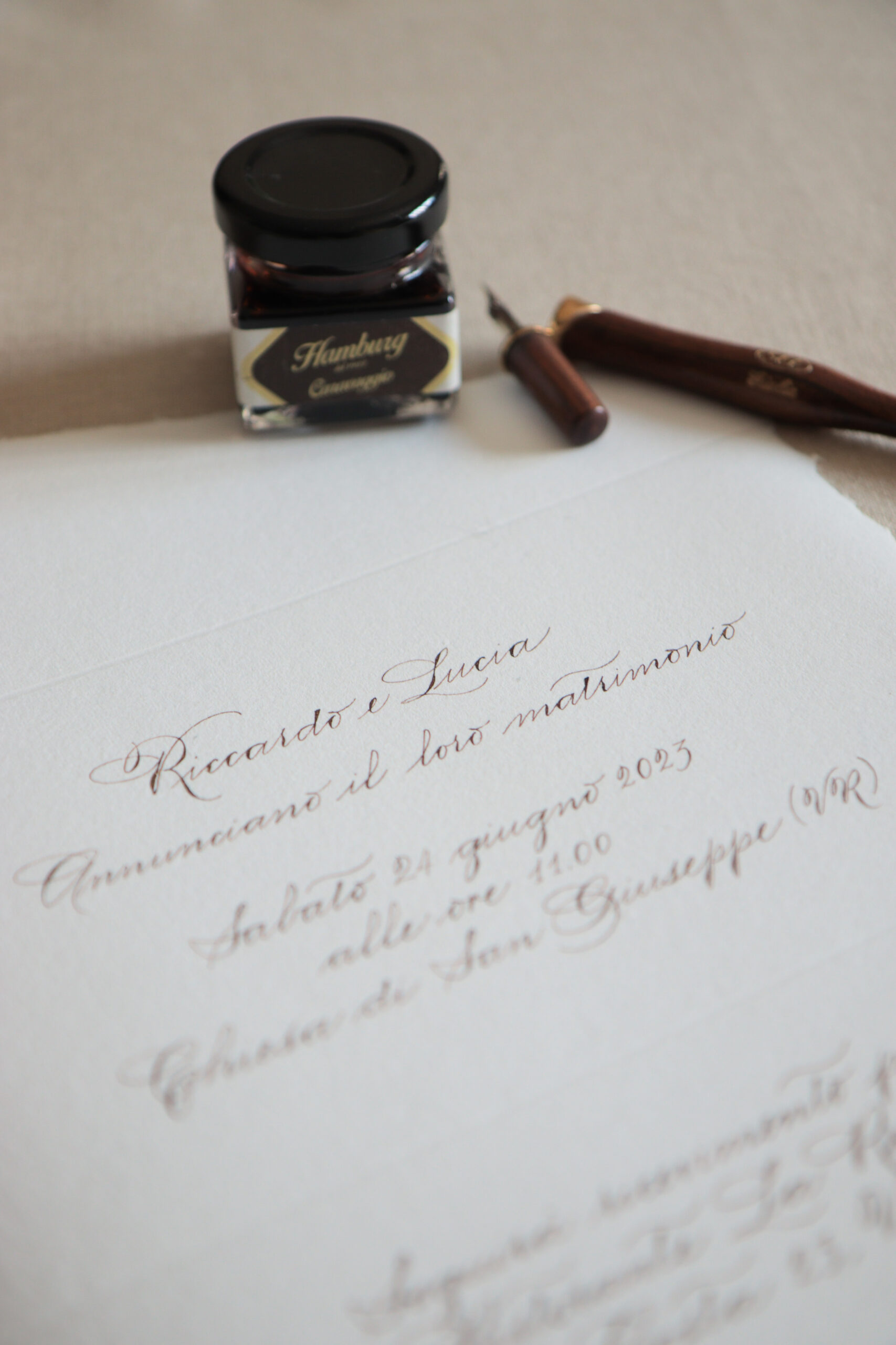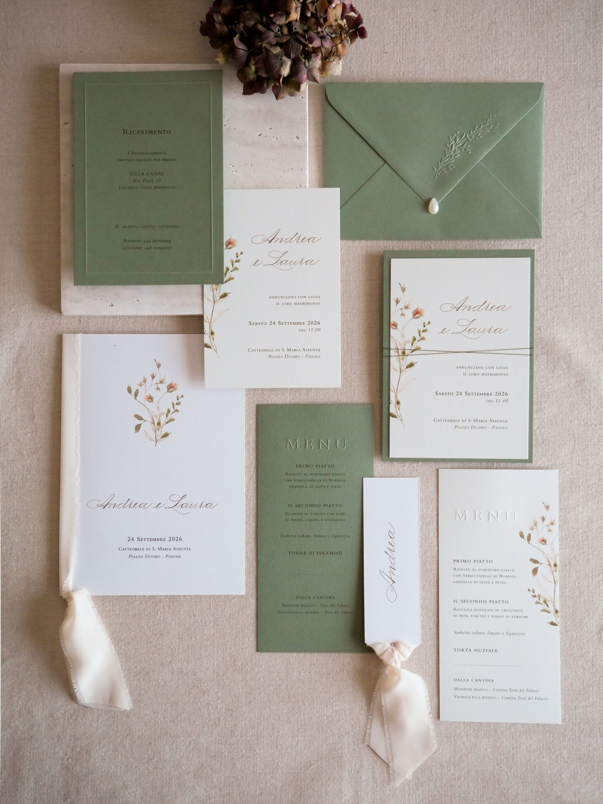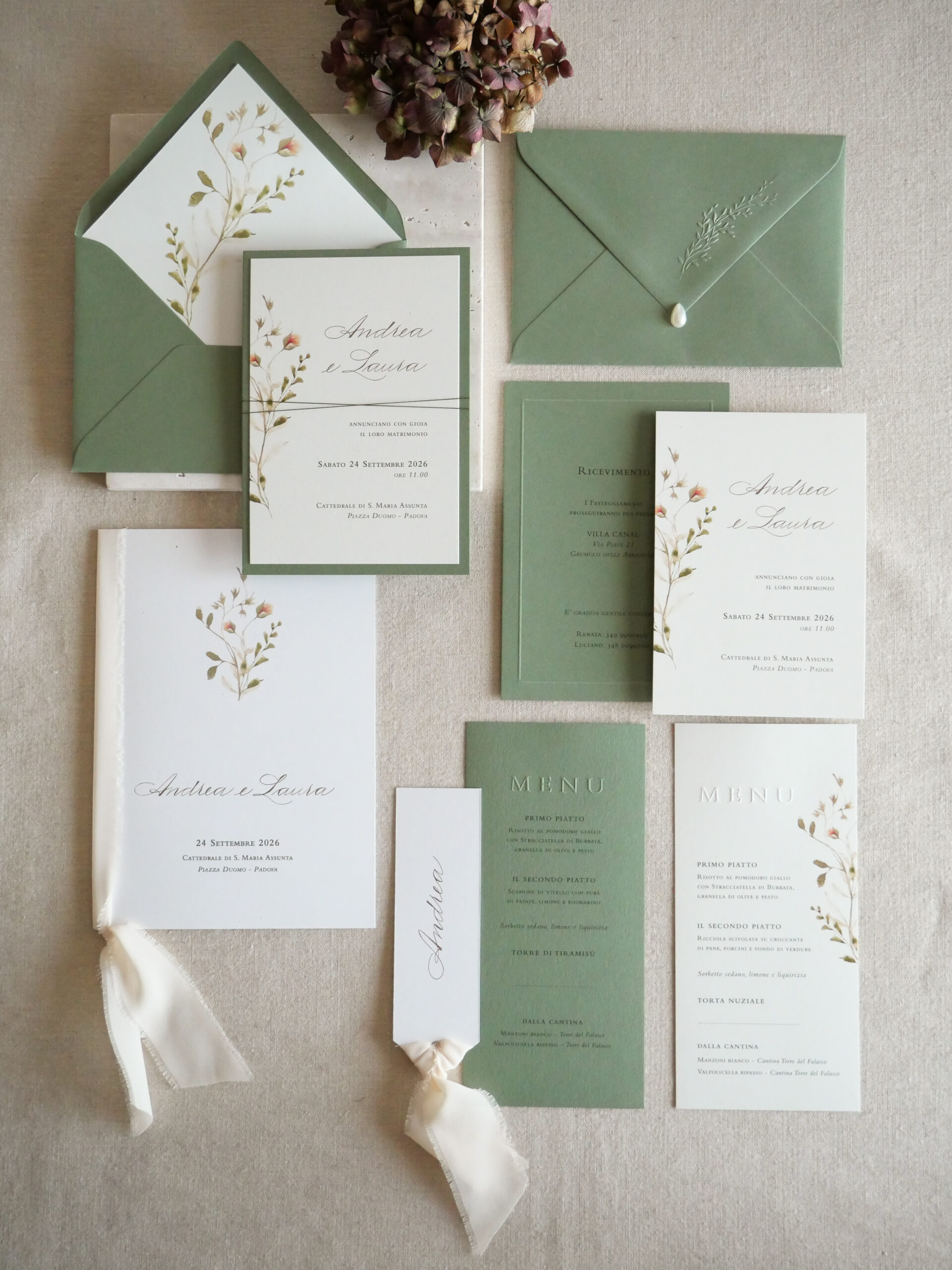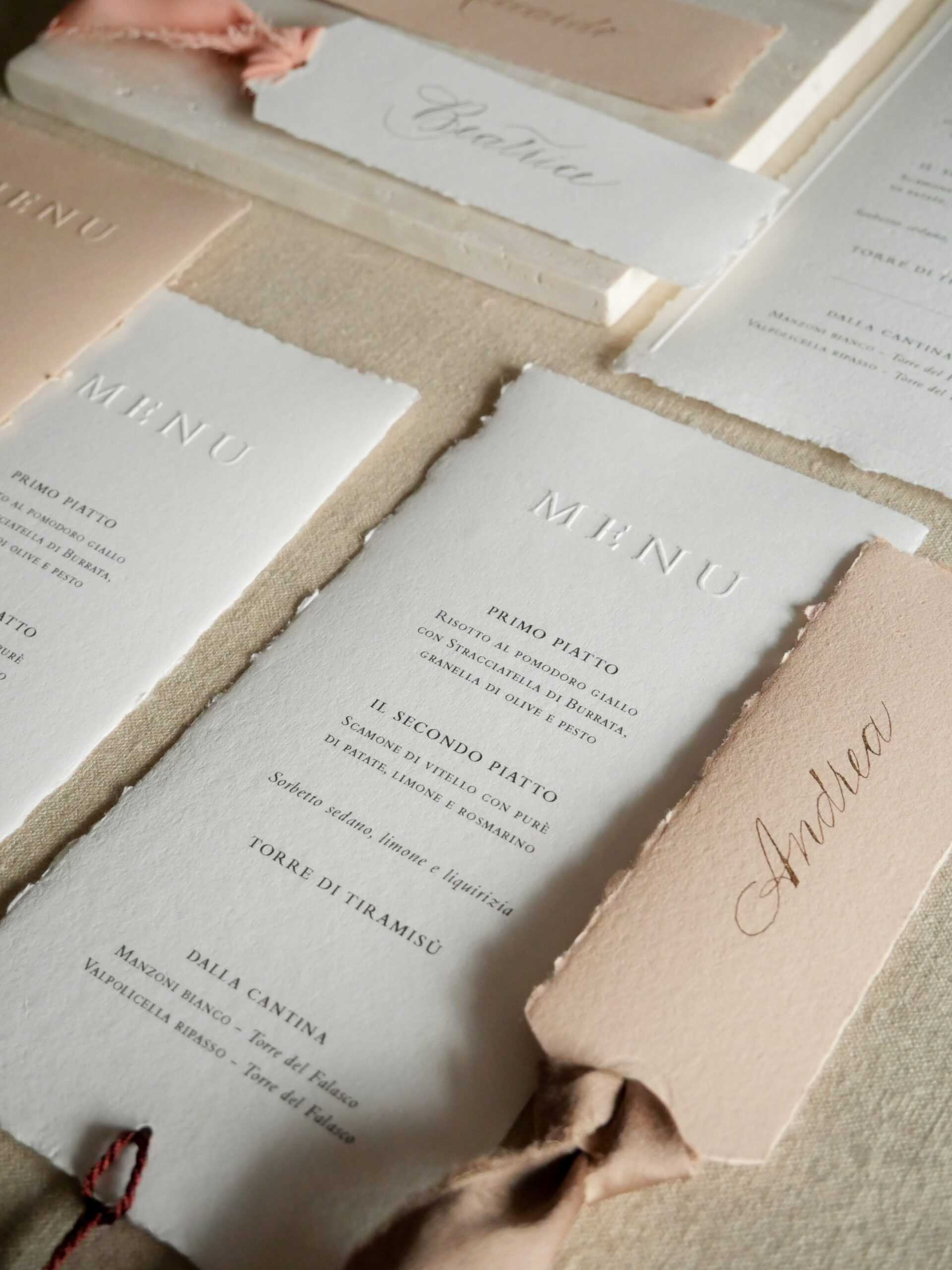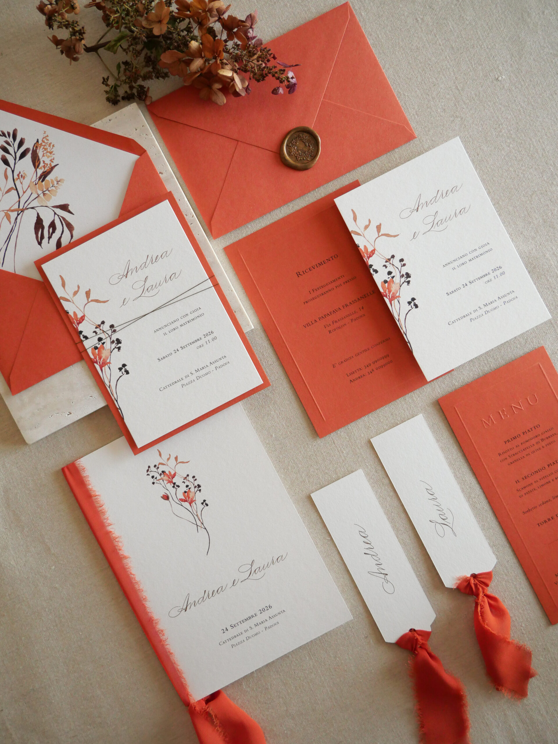 - La LINEA MATERIA, in cui la carta si fa viva e tattile. Ogni invito unisce carte e buste artigianali, realizzate a mano dalla cartiera italiana Mc Paper. Per chi ama la poesia delle imperfezioni e il fascino di un dettaglio dal sapore unico.