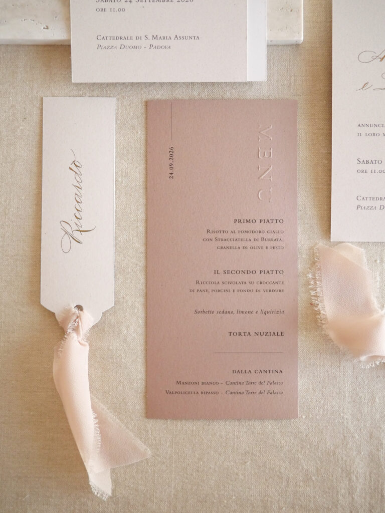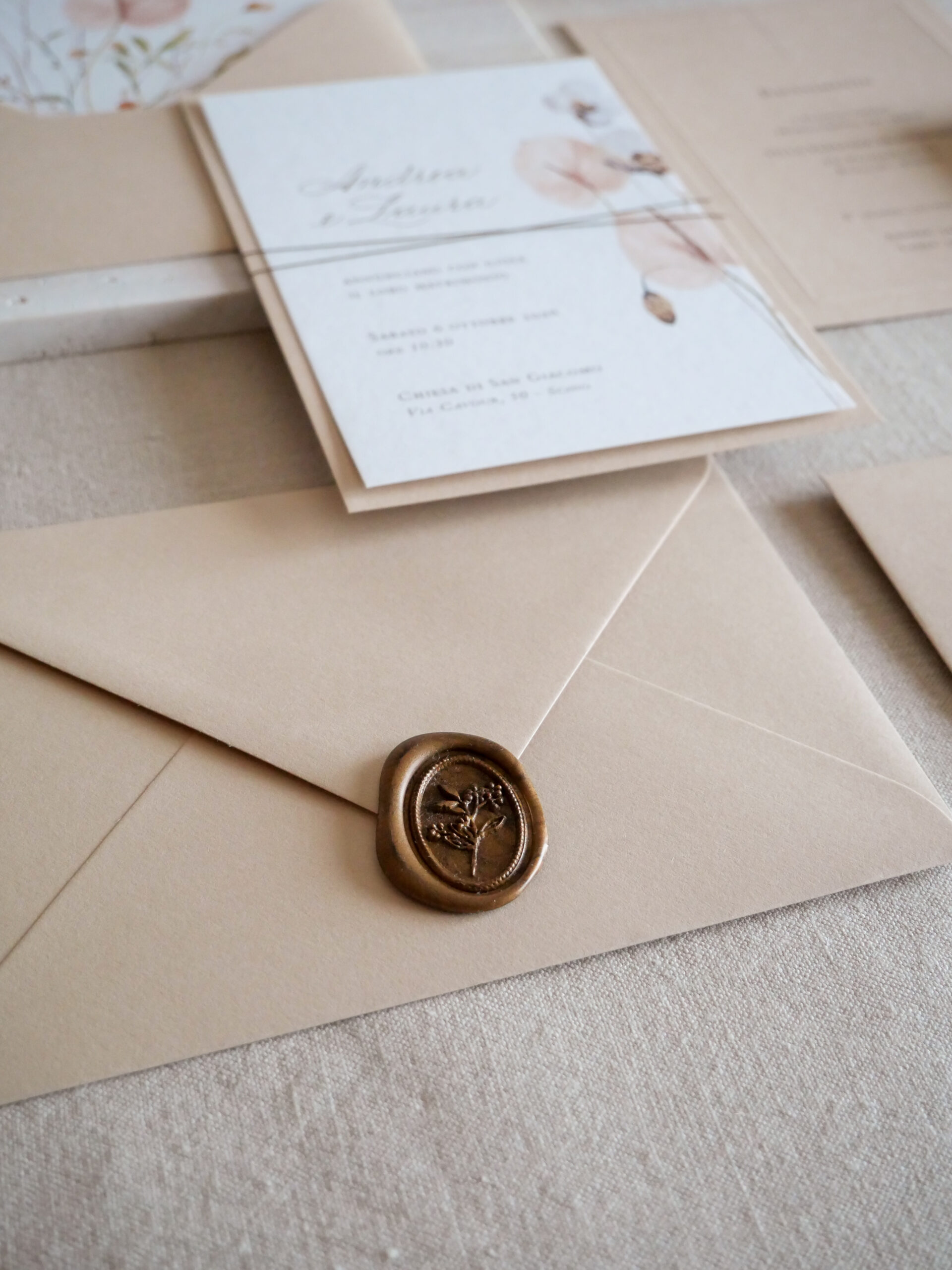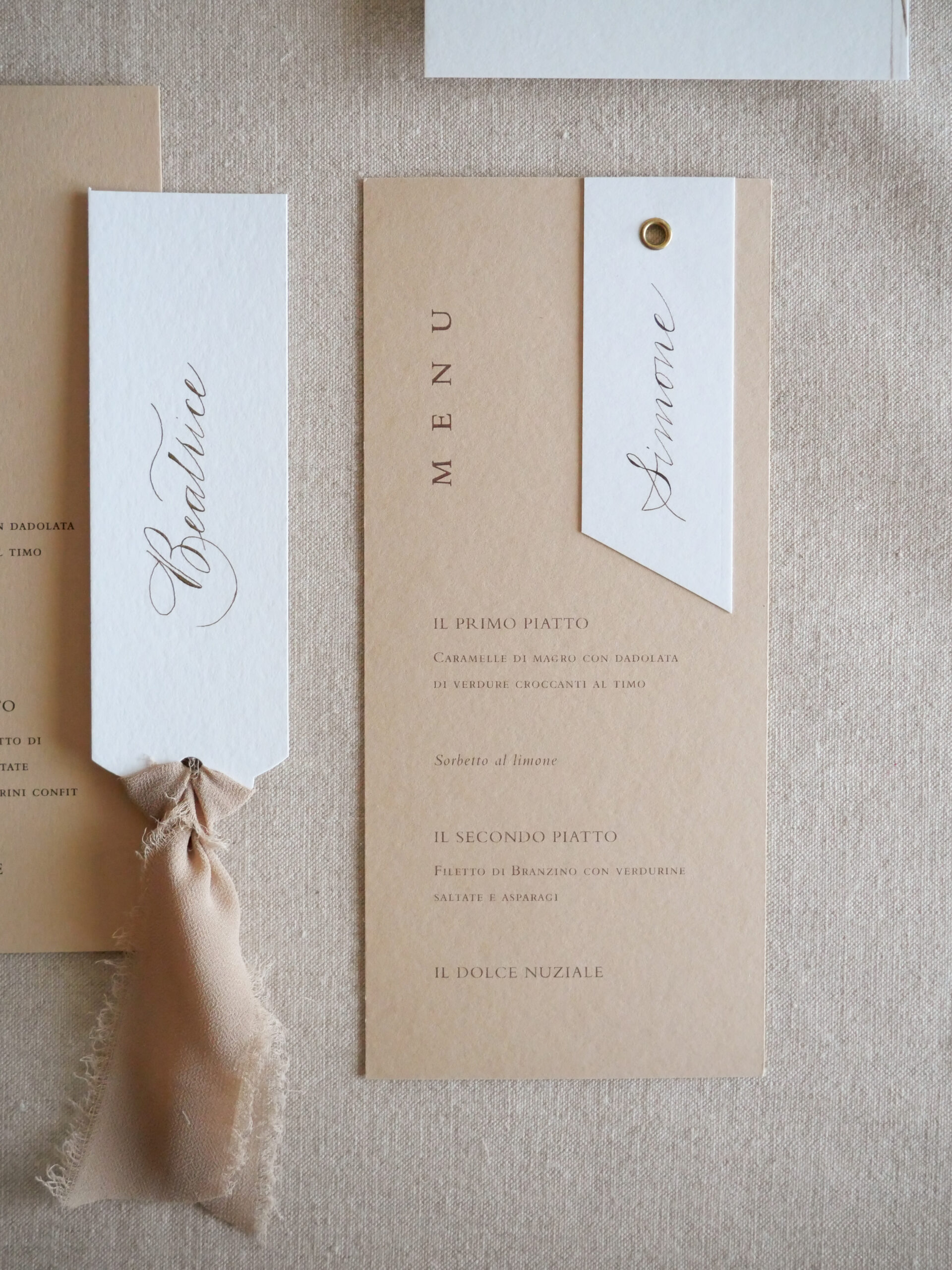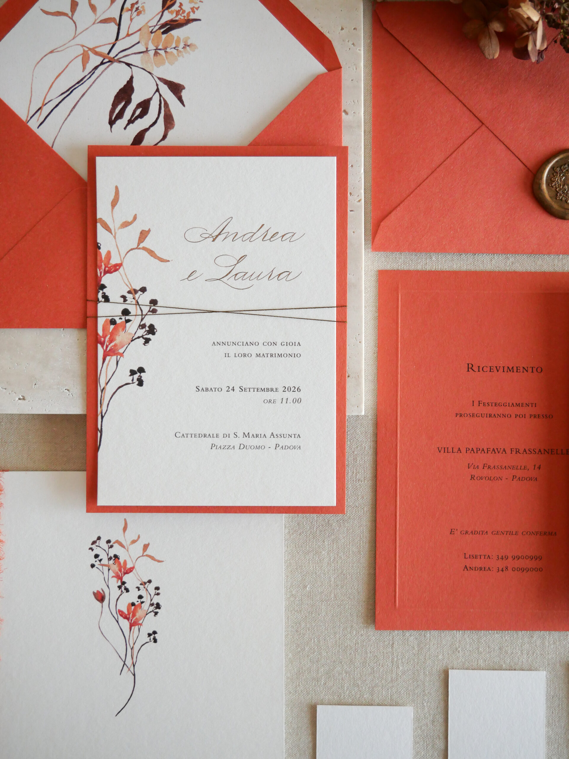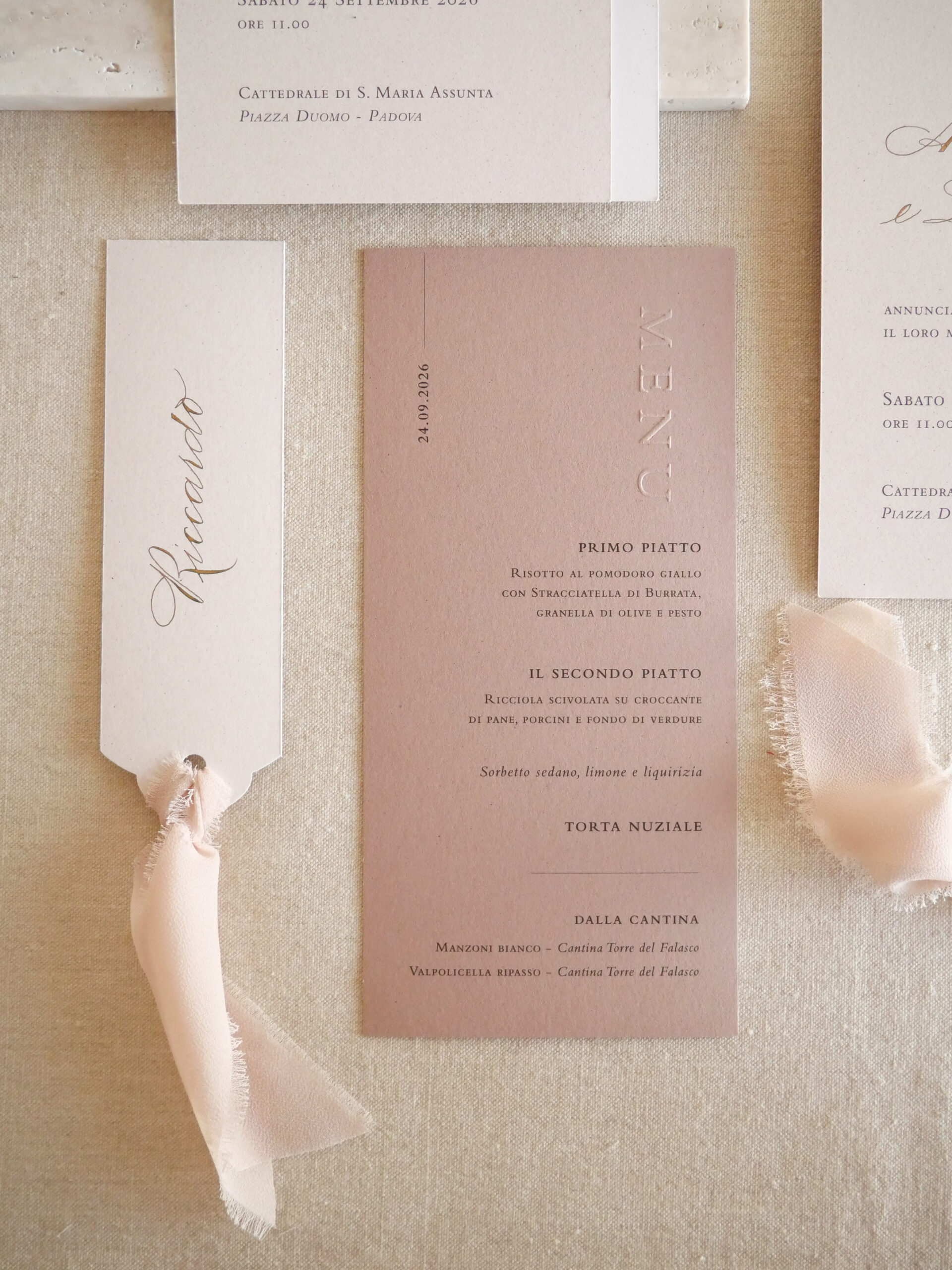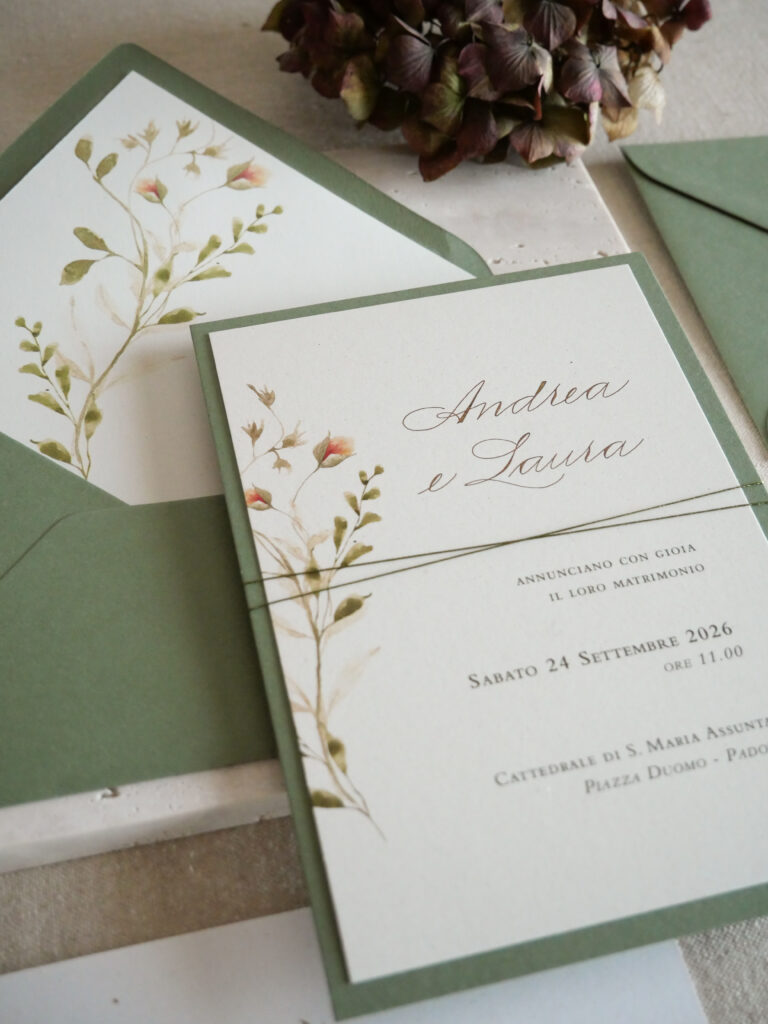 - La LINEA MATERIA, in cui la carta si fa viva e tattile. Ogni invito unisce carte e buste artigianali, realizzate a mano dalla cartiera italiana Mc Paper. Per chi ama la poesia delle imperfezioni e il fascino di un dettaglio dal sapore unico.